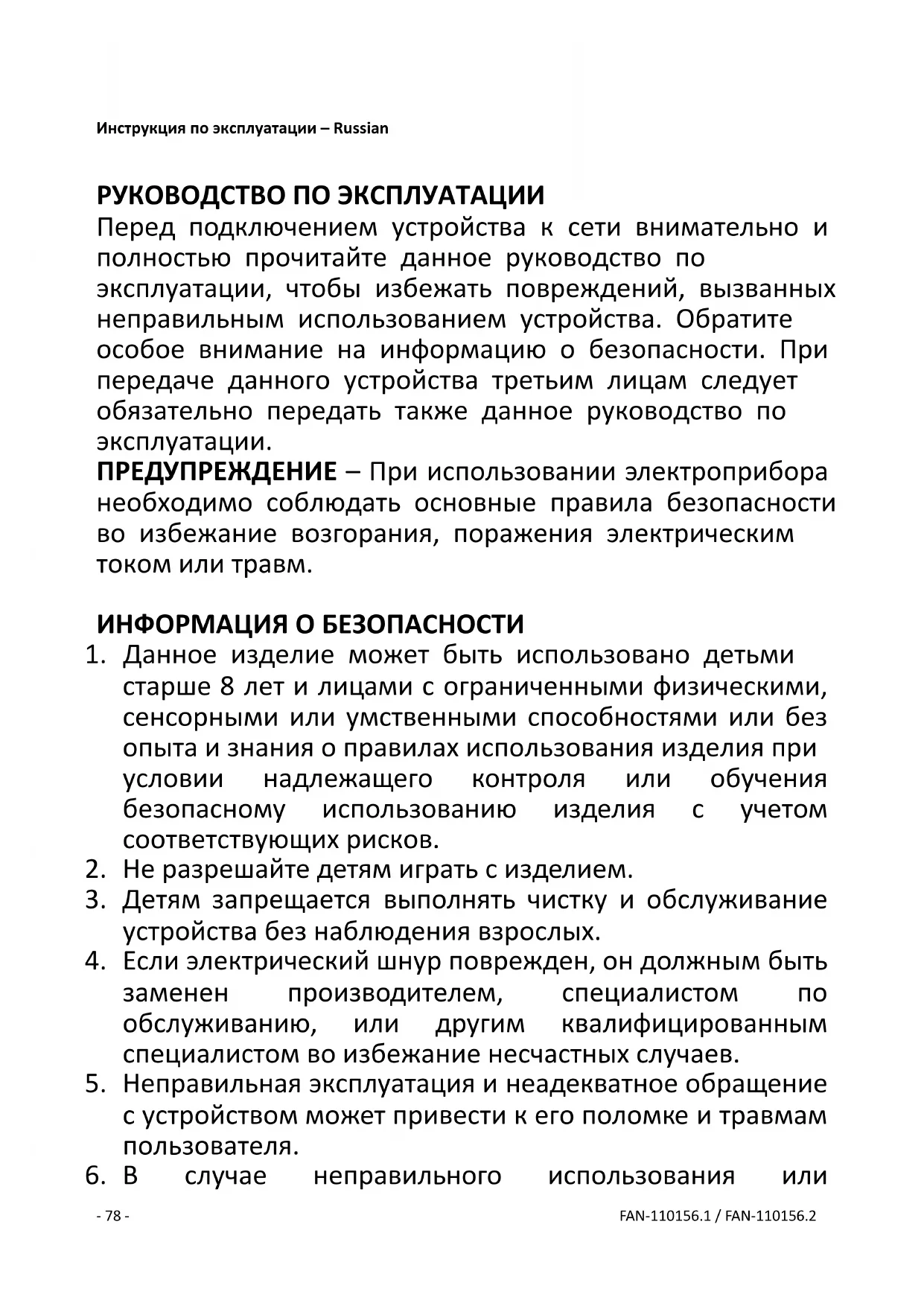 Resirkulering – EU-direktiv 2012/19/EU Dette symbolet indikerer at produktet ikke skal kastes sammen med husholdningsavfall. For å hindre mulig skade på miljøet eller menneskers helse fra ukontrollert søppelkasting, skal enheten resirkuleres ansvarsfullt for å fremme bæ rekraftig gjenbruk av materialressurser. For å returnere den brukte enheten, bruk returpunkter og innsamlingssystemer eller ta kontakt med forhandleren der produktet ble kjøpt. De kan ta imot dette produktet for miljøvennlig resirkulering.- 78 - FAN-110156.1 / FAN-110156.2 Инструкция по эксплуатации – Russian РУКОВОДСТВО ПО ЭКСПЛУАТАЦИИ Перед подключением устройства к сети внимательно и полностью прочитайте данное руководство по эксплуатации, чтобы избежать повреждений, вызванных неправильным использованием устройства. Обратите особое внимание на информацию о безопасности. При передаче данного устройства третьим лицам следует обязательно передать также данное руководство по эксплуатации. ПРЕДУПРЕЖДЕНИЕ – При использовании электроприбора необходимо соблюдать основные правила безопасности во избежание возгорания, поражения электрическим током или травм. ИНФОРМАЦИЯ О БЕЗОПАСНОСТИ