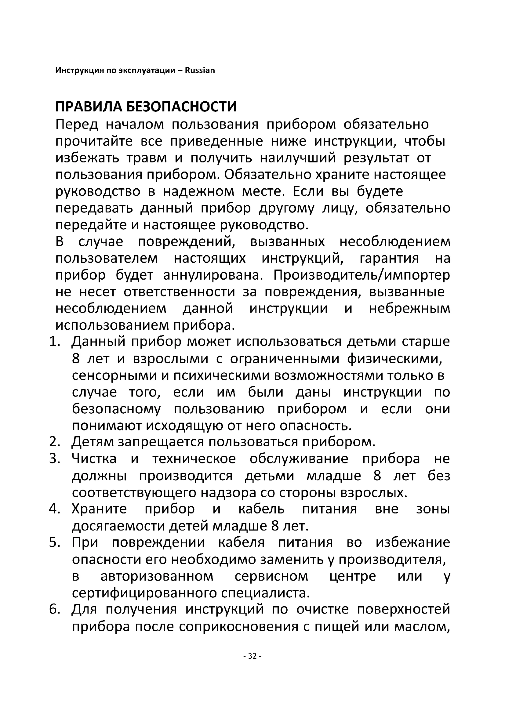 прибора после соприкосновения с пищей или маслом,- 33 - смотрите раздел "ЧИСТКА И ОБСЛУЖИВАНИЕ" данной инструкции.