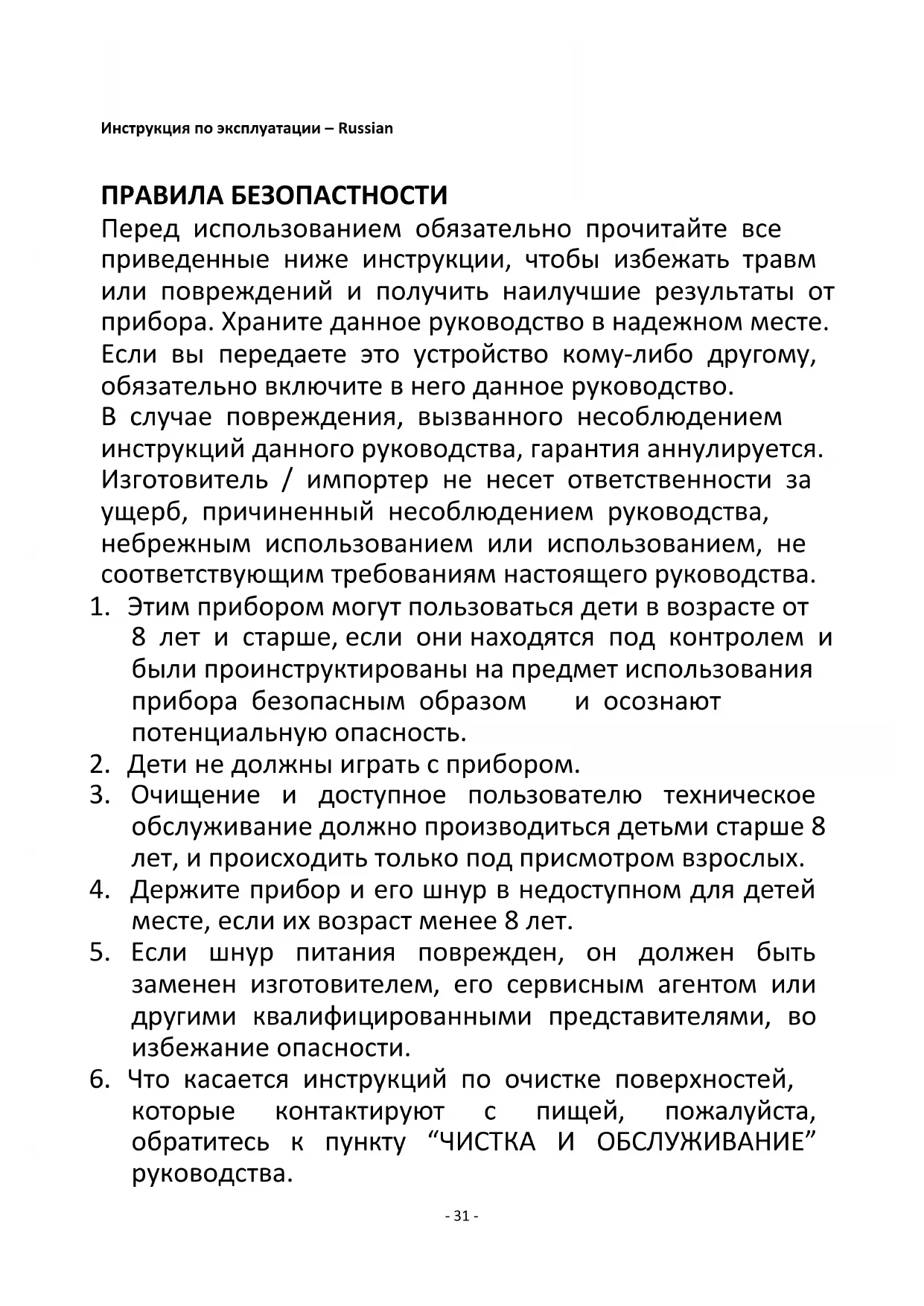 которые контактируют с пищей, пожалуйста, обратитесь к пункту “ЧИСТКА И ОБСЛУЖИВАНИЕ” руководства.- 32 -