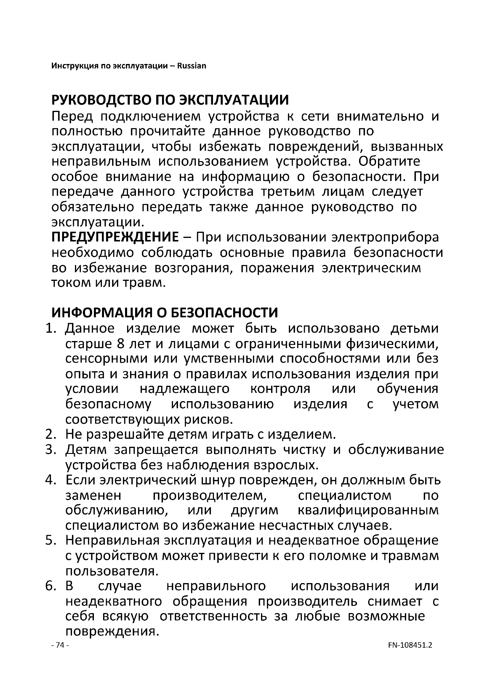 неадекватного обращения производитель снимает с себя всякую ответственность за любые возможные повреждения.- 75 - FN-108451.2