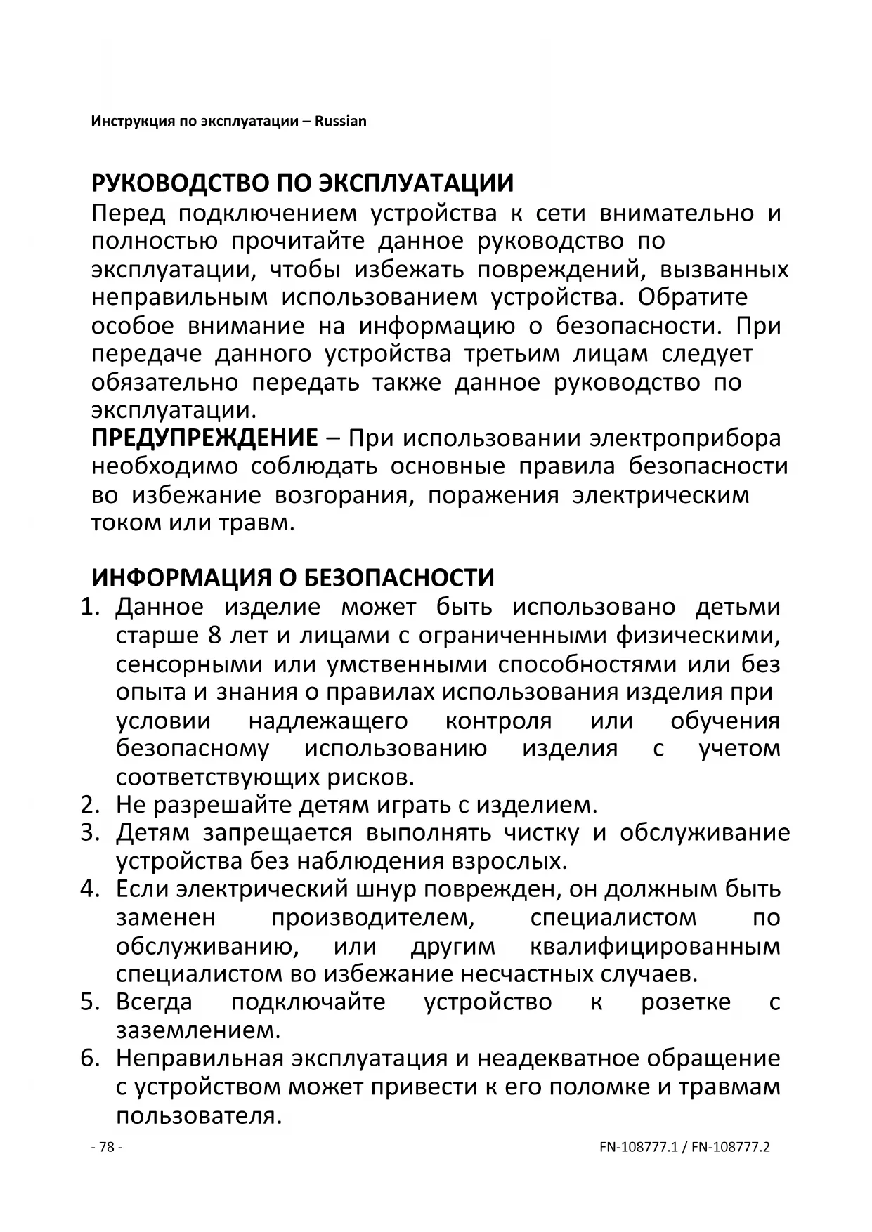 Resirkulering Denne merkingen viser til at dette produktet ikke skal kastes sammen med annen husholdningsavfall i 2012/19/EU. For å hindre mulig skade på miljøet eller menneskers helse fra ukontrollert søppelkasting, skal enheten resirkuleres ansvarsfullt for å fremme bæ rekraftig gjenbruk av materialressurser. For å returnere den brukte enheten, bruk returpunkter og innsamlingssystemer eller ta kontakt med forhandleren der produktet ble kjøpt. De kan ta imot dette produktet for miljøvennlig resirkulering.- 78 - FN-108777.1 / FN-108777.2 Инструкция по эксплуатации – Russian РУКОВОДСТВО ПО ЭКСПЛУАТАЦИИ Перед подключением устройства к сети внимательно и полностью прочитайте данное руководство по эксплуатации, чтобы избежать повреждений, вызванных неправильным использованием устройства. Обратите особое внимание на информацию о безопасности. При передаче данного устройства третьим лицам следует обязательно передать также данное руководство по эксплуатации. ПРЕДУПРЕЖДЕНИЕ – При использовании электроприбора необходимо соблюдать основные правила безопасности во избежание возгорания, поражения электрическим током или травм. ИНФОРМАЦИЯ О БЕЗОПАСНОСТИ