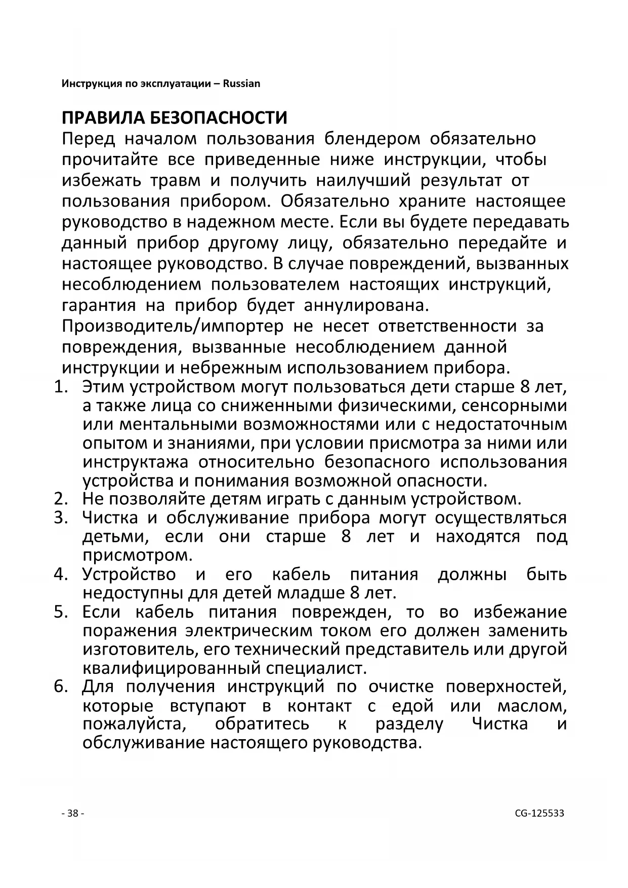 (например, щетки или нож). Осторожно: Не погружайте прибор в воду либо иные жидкости. Это опасно для жизни и может вызвать электрический шок! ТЕХНИЧЕСКИЕ ДАННЫЕ Рабочий диапазон: 220-240V ~ 50-60Hz Потребление энергии: 1600W ГАРАНТИЯ И ТЕХНИЧЕСКОЕ ОБСЛУЖИВАНИЕ: Перед поступлением в продажу наши устройства проходят строгий контроль качества. Если, несмотря на все меры предосторожности, вы все же приобрели поврежденный прибор, пожалуйста, верните устройство продавцу. В соответствии с условиями гарантии на приобретенный прибор предоставляется гарантийное обслуживание на 2 год, начиная со дня продажи. Если вы приобрели прибор с дефектом, вы можете незамедлительно вернуть его по месту покупки. На дефекты, возникшие вследствие неправильного использования прибора, а также на неисправности, произошедшие вследствие ремонта прибора несертифицированными центрами или третьими лицами, а также вследствие установки неоригинальных деталей, данная гарантия не распространяется.- 43 - CG-125533 Всегда сохраняйте чек и гарантийный талон. Без них вы не сможете претендовать на какую-либо форму