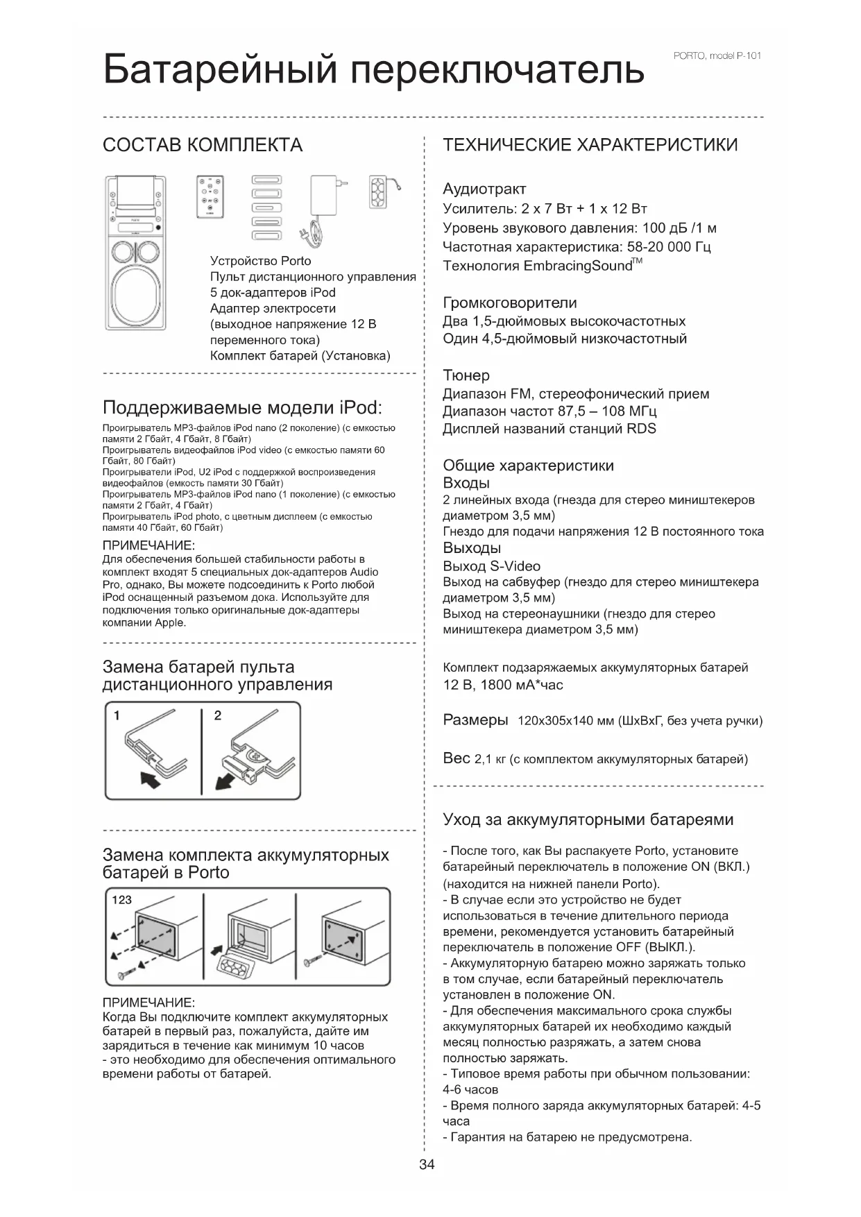 PORTO, model P-101- После того, как Вы распакуете Porto, установите батарейный переключатель в положение ON (ВКЛ.) (находится на нижней панели Porto).- В случае если это устройство не будет использоваться в течение длительного периода времени, рекомендуется установить батарейный переключатель в положение OFF (ВЫКЛ.).- Аккумуляторную батарею можно заряжать только в том случае, если батарейный переключатель установлен в положение ON.- Для обеспечения максимального срока службы аккумуляторных батарей их необходимо каждый месяц полностью разряжать, а затем снова полностью заряжать.- Типовое время работы при обычном пользовании: 4-6 часов- Время полного заряда аккумуляторных батарей: 4-5 - Гарантия на батарею не предусмотрена. СОСТАВ КОМПЛЕКТА ТЕХНИЧЕСКИЕ ХАРАКТЕРИСТИКИ Устройство PortoПульт дистанционного управления5 док-адаптеров iPodАдаптер электросети(выходное напряжение 12 В переменного тока)Комплект батарей (Установка) Замена батарей пульта дистанционного управления Замена комплекта аккумуляторных батарей в Porto ПРИМЕЧАНИЕ:Когда Вы подключите комплект аккумуляторных батарей в первый раз, пожалуйста, дайте им зарядиться в течение как минимум 10 часов - это необходимо для обеспечения оптимального времени работы от батарей. Поддерживаемые модели iPod: ПРИМЕЧАНИЕ:Для обеспечения большей стабильности работы в комплект входят 5 специальных док-адаптеров Audio Pro, однако, Вы можете подсоединить к Porto любой iPod оснащенный разъемом дока. Используйте для подключения только оригинальные док-адаптерыкомпании Apple.Проигрыватель МР3-файлов iPod nano (2 поколение) (с емкостью памяти 2 Гбайт, 4 Гбайт, 8 Гбайт)Проигрыватель видеофайлов iPod video (с емкостью памяти 60 Гбайт, 80 Гбайт)Проигрыватели iPod, U2 iPod с поддержкой воспроизведения видеофайлов (емкость памяти 30 Гбайт)Проигрыватель МР3-файлов iPod nano (1 поколение) (с емкостью памяти 2 Гбайт, 4 Гбайт)Проигрыватель iPod photo, с цветным дисплеем (с емкостью памяти 40 Гбайт, 60 Гбайт) Уход за аккумуляторными батареями