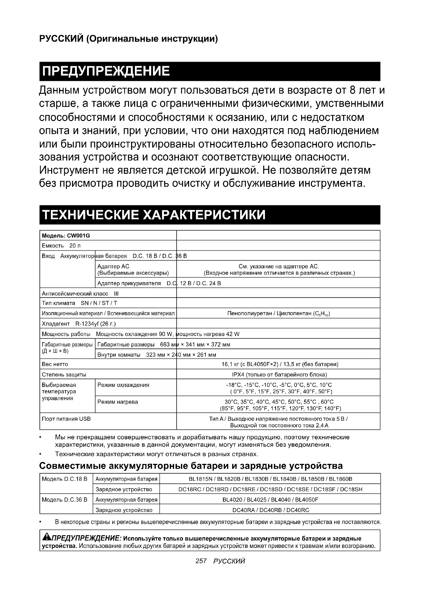 РУССКИЙ (Оригинальные инструкции) ПРЕДУПРЕЖДЕНИЕ Даннымустройствоммогутпользоватьсядетиввозрастеот8лети старше,атакжелицасограниченнымифизическими,умственными способностямииспособностямикосязанию,илиснедостатком опытаизнаний,приусловии,чтоонинаходятсяподнаблюдением илибылипроинструктированыотносительнобезопасногоисполь- зованияустройстваиосознаютсоответствующиеопасности. Инструментнеявляетсядетскойигрушкой.Непозволяйтедетям безприсмотрапроводитьочисткуиобслуживаниеинструмента. ТЕХНИЧЕСКИЕ ХАРАКТЕРИСТИКИ Модель: CW001GЕмкость 20лВход Аккумуляторнаябатарея D.C.18В/D.C.36ВАдаптерАС (Выбираемыеаксессуары)См.указаниенаадаптереАС.(Входноенапряжениеотличаетсявразличныхстранах.)Адаптерприкуривателя D.C.12В/D.C.24ВАнтисейсмическийкласс IIIТипклимата SN / N / ST / TИзоляционныйматериал/ВспенивающийсяматериалПенополиуретан/Циклопентан(C