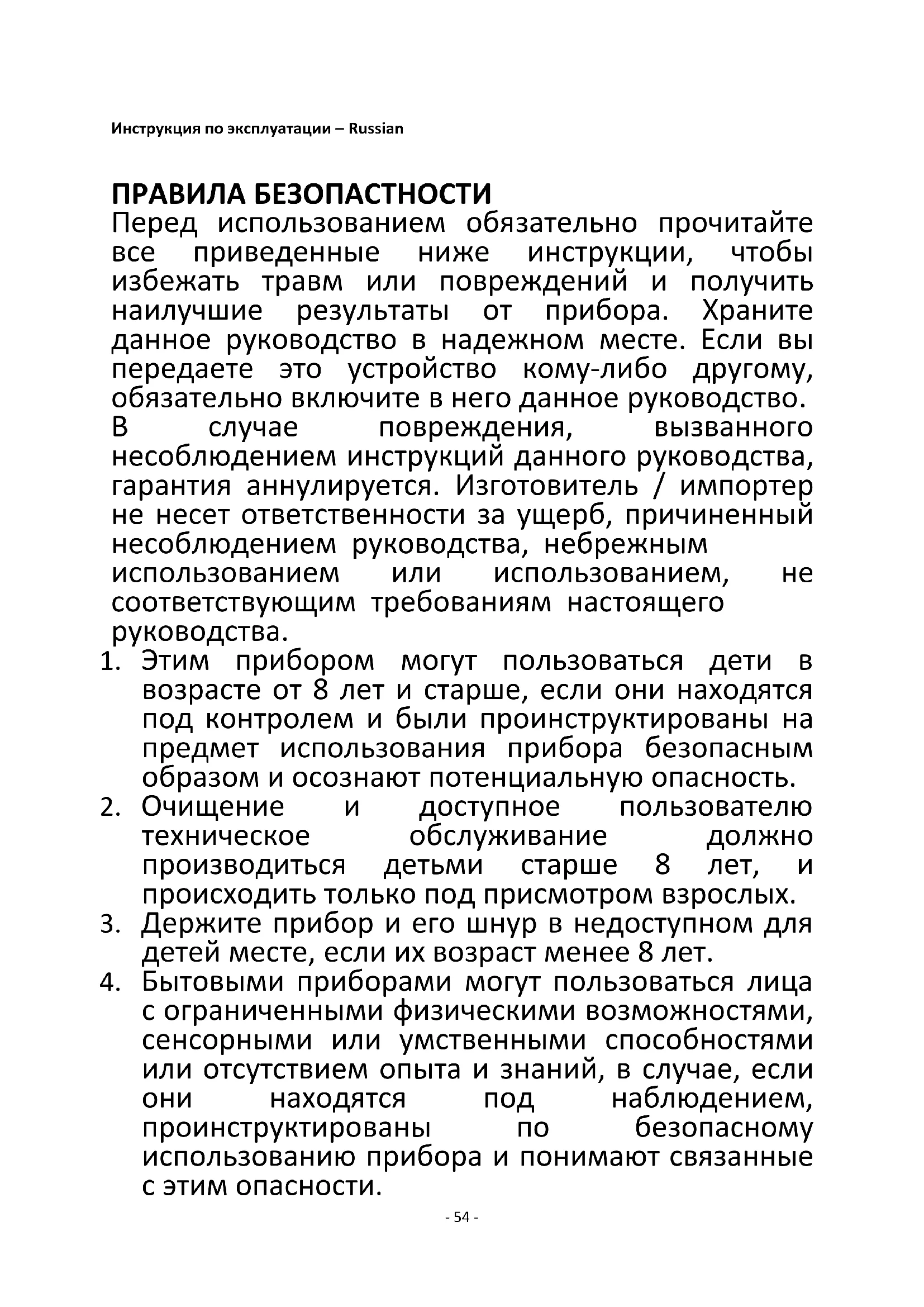 с ограниченными физическими возможностями, сенсорными или умственными способностями или отсутствием опыта и знаний, в случае, если они находятся под наблюдением, проинструктированы по безопасному использованию прибора и понимают связанные с этим опасности.- 55 -
