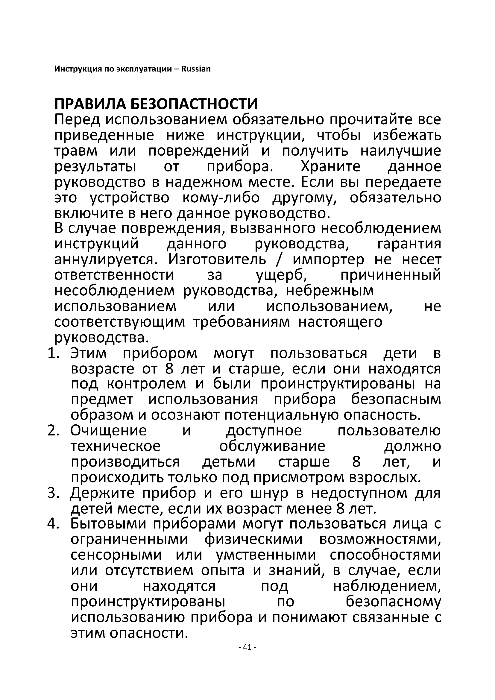 ограниченными физическими возможностями, сенсорными или умственными способностями или отсутствием опыта и знаний, в случае, если они находятся под наблюдением, проинструктированы по безопасному использованию прибора и понимают связанные с этим опасности.- 42 -