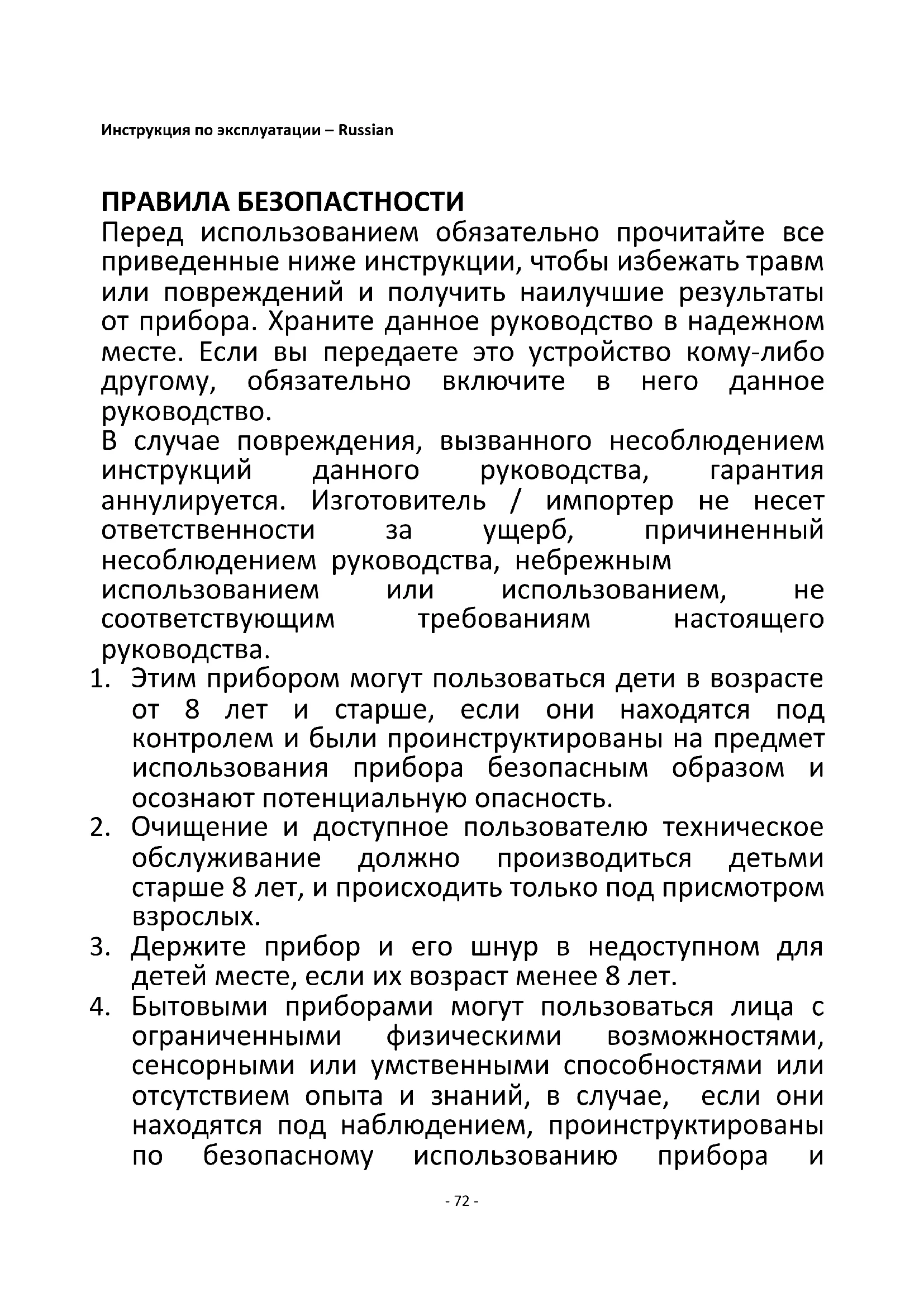 ограниченными физическими возможностями, сенсорными или умственными способностями или отсутствием опыта и знаний, в случае, если они находятся под наблюдением, проинструктированы по безопасному использованию прибора и- 73 - понимают связанные с этим опасности.