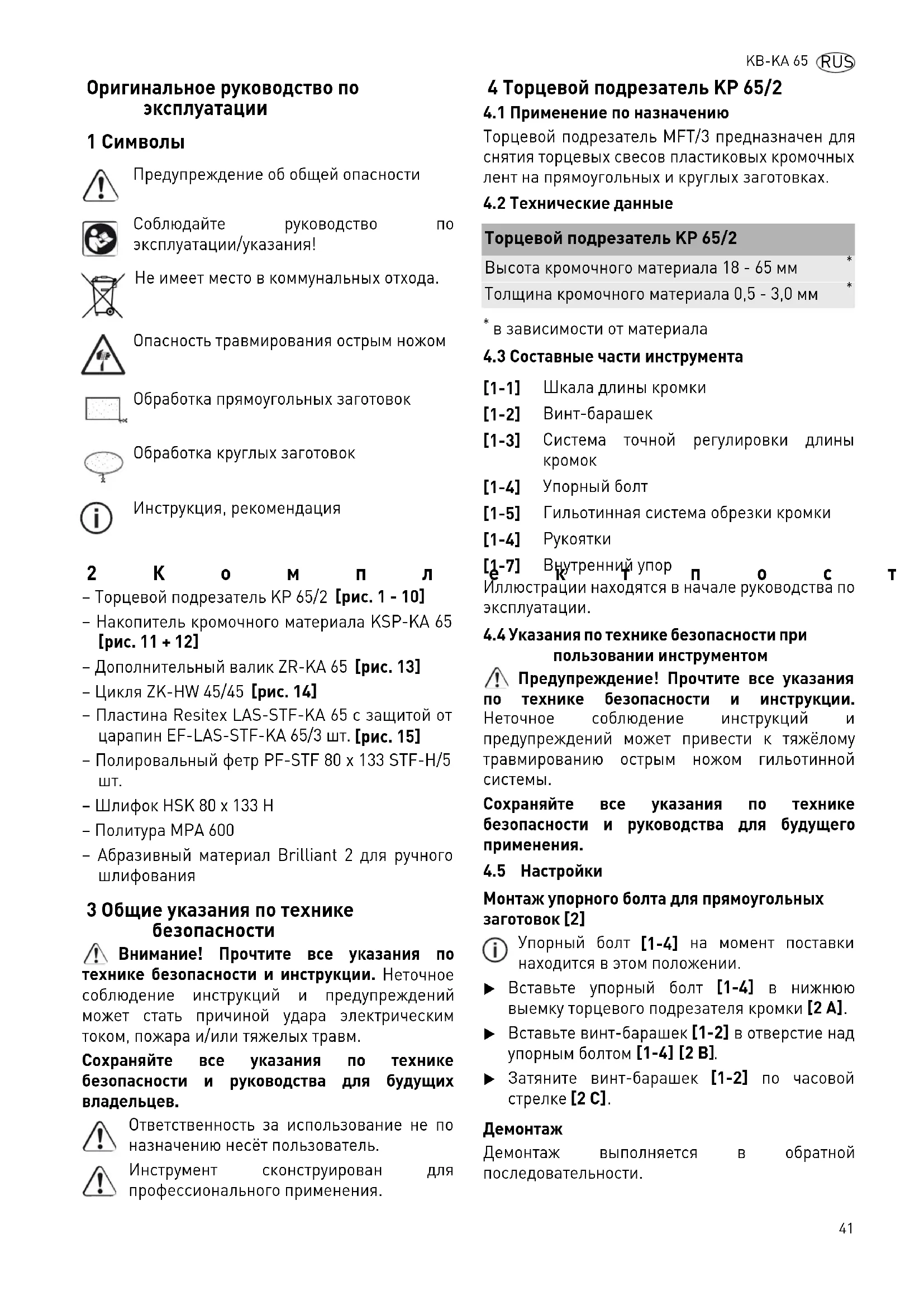RUS Оригинальное руководство по эксплуатации 1 Символы 2Комплект поставки – Торцевой подрезатель KP 65/2 [рис. 1 - 10] – Накопитель кромочного материала KSP-KA 65 [рис. 11 + 12] – Дополнительный валик ZR-KA 65 [рис. 13] – Цикля ZK-HW 45/45 [рис. 14] – Пластина Resitex LAS-STF-KA 65 с защитой от царапин EF-LAS-STF-KA 65/3 шт. [рис. 15] – Полировальный фетр PF-STF 80 x 133 STF-H/5
