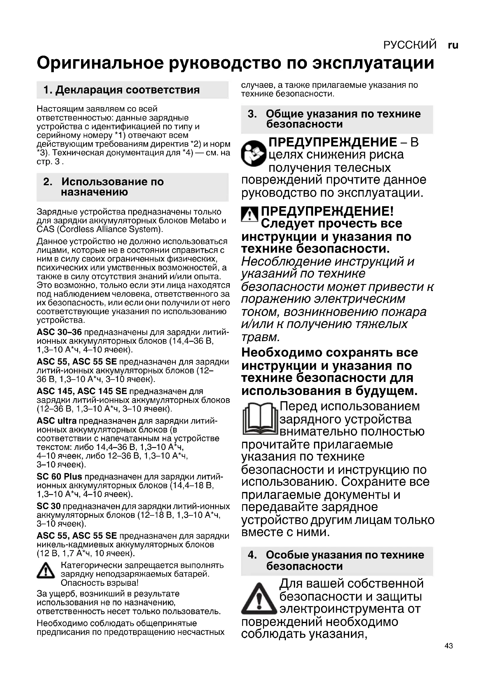 Оригинальное руководство по эксплуатации Настоящим заявляем со всей ответственностью: данные зарядные устройства с идентификацией по типу и серийному номеру *1) отвечают всем действующим требованиям директив *2) и норм *3). Техническая документация для *4) — см. на стр.3. Зарядные устройства предназначены только для зарядки аккумуляторных блоков Metabo и CAS (Cordless Alliance System). Данное устройство не должно использоваться лицами, которые не в состоянии справиться с