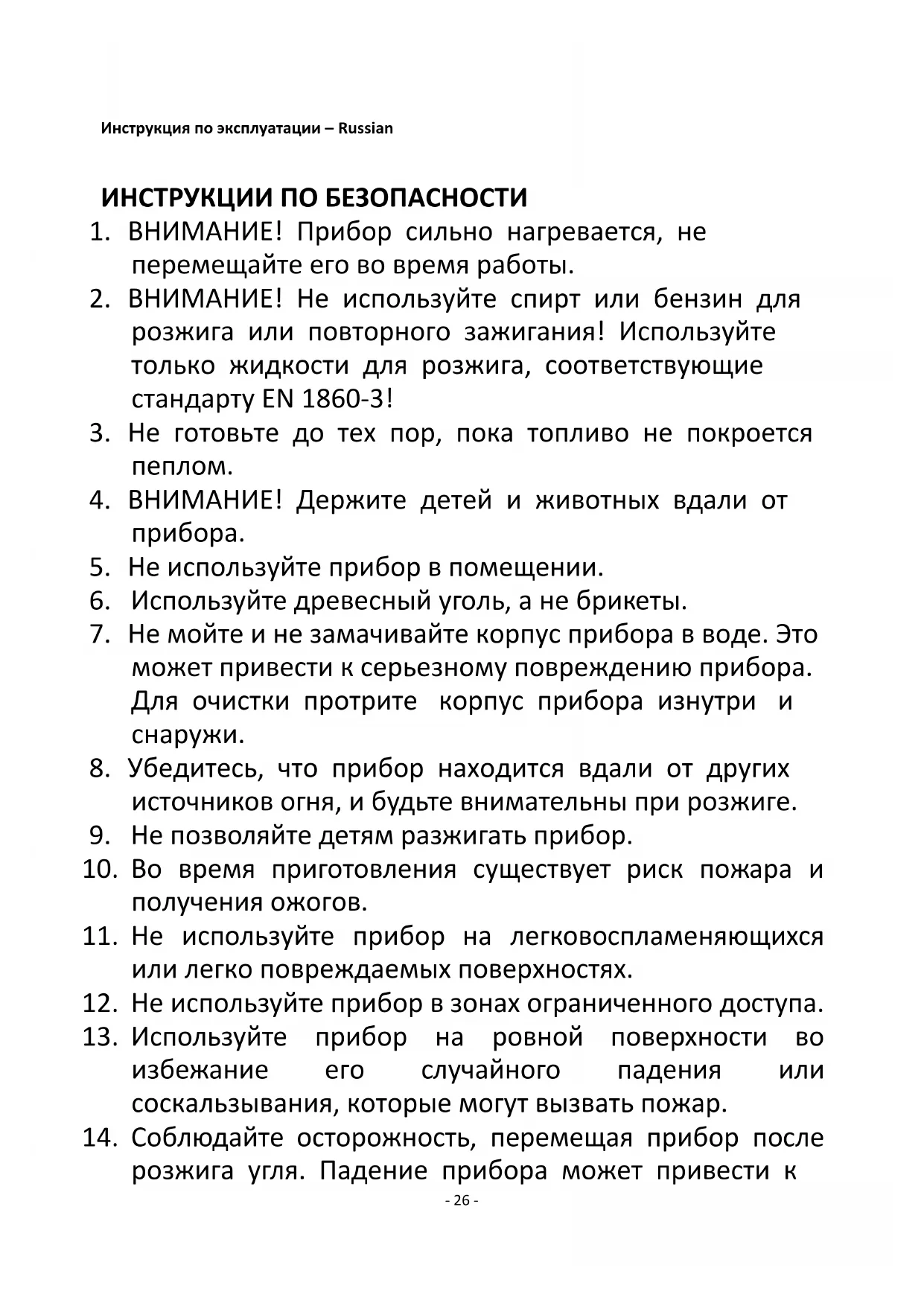 розжига или повторного зажигания! Используйте только жидкости для розжига, соответствующие стандарту EN 1860-3!