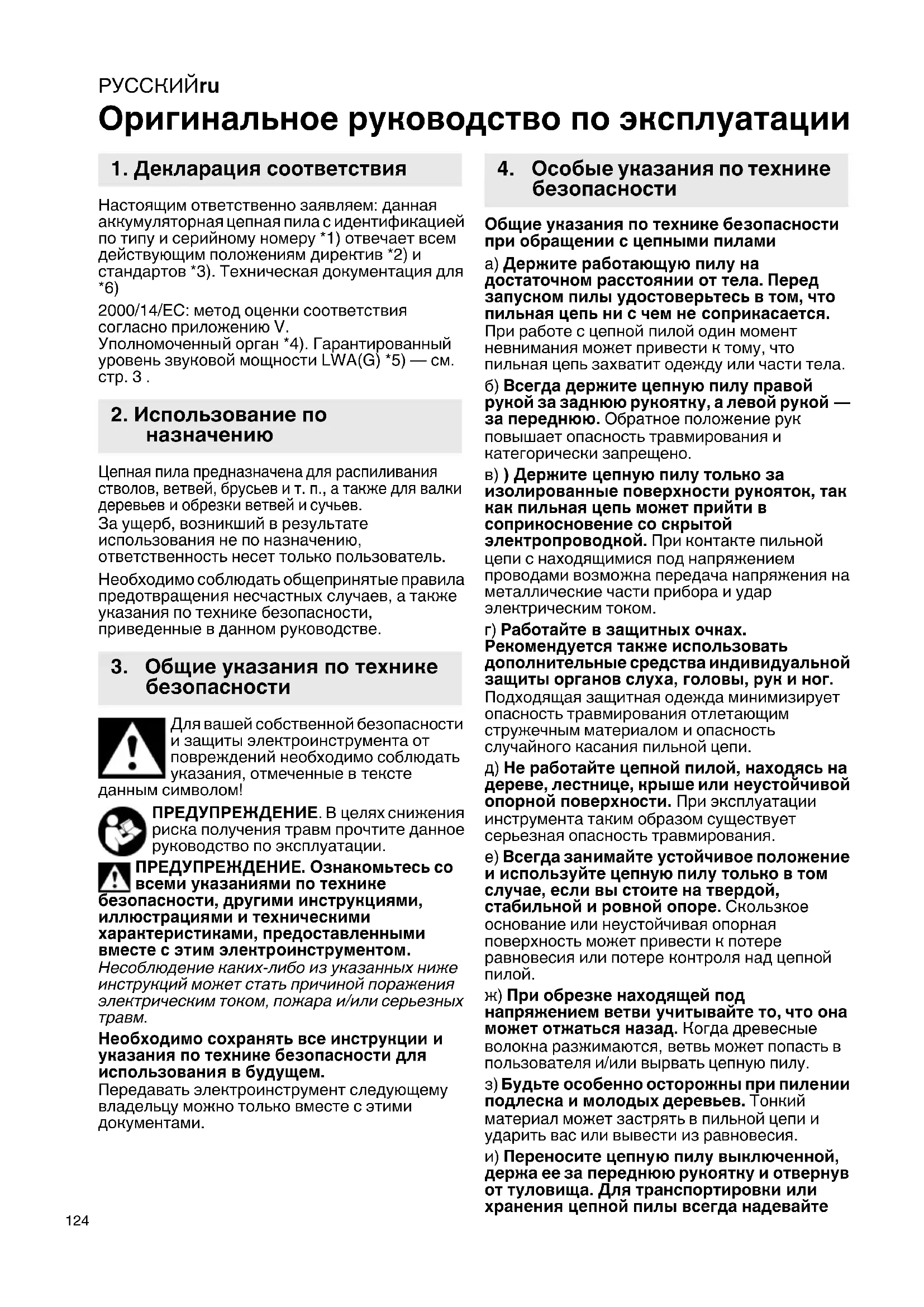Оригинальное руководство по эксплуатации Настоящим ответственно заявляем: данная аккумуляторная цепная пила с идентификацией по типу и серийному номеру *1) отвечает всем действующим положениям директив *2) и стандартов *3). Техническая документация для *6) 2000/14/EС: метод оценки соответствия согласно приложению V. Уполномоченный орган *4). Гарантированный уровень звуковой мощности LWA(G) *5) — см. стр.3. Цепная пила предназначена для распиливания стволов, ветвей, брусьев и т. п., а также для валки деревьев и обрезки ветвей и сучьев. За ущерб, возникший в результате использования не по назначению, ответственность несет только пользователь. Необходимо соблюдать общепринятые правила предотвращения несчастных случаев, а также указания по технике безопасности, приведенные в данном руководстве. Для вашей собственной безопасности и защиты электроинструмента от повреждений необходимо соблюдать указания, отмеченные в тексте данным символом! ПРЕДУПРЕЖДЕНИЕ. В целях снижения риска получения травм прочтите данное руководство по эксплуатации. ПРЕДУПРЕЖДЕНИЕ. Ознакомьтесь со всеми указаниями по технике безопасности, другими инструкциями, иллюстрациями и техническими характеристиками, предоставленными вместе с этим электроинструментом. Несоблюдение каких-либо из указанных ниже инструкций может стать причиной поражения электрическим током, пожара и/или серьезных
