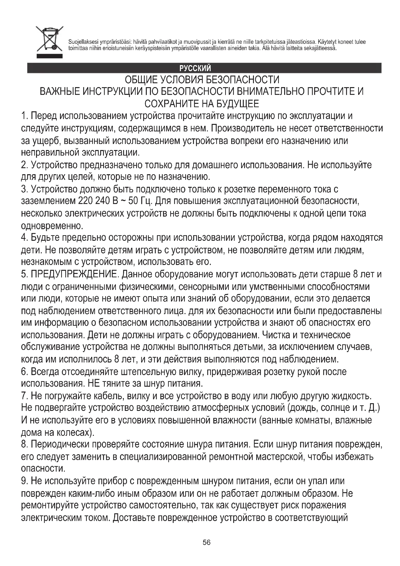 следуйте инструкциям, содержащимся в нем. Производитель не несет ответственности за ущерб, вызванный использованием устройства вопреки его назначению или неправильной эксплуатации. ОБЩИЕ УСЛОВИЯ БЕЗОПАСНОСТИ