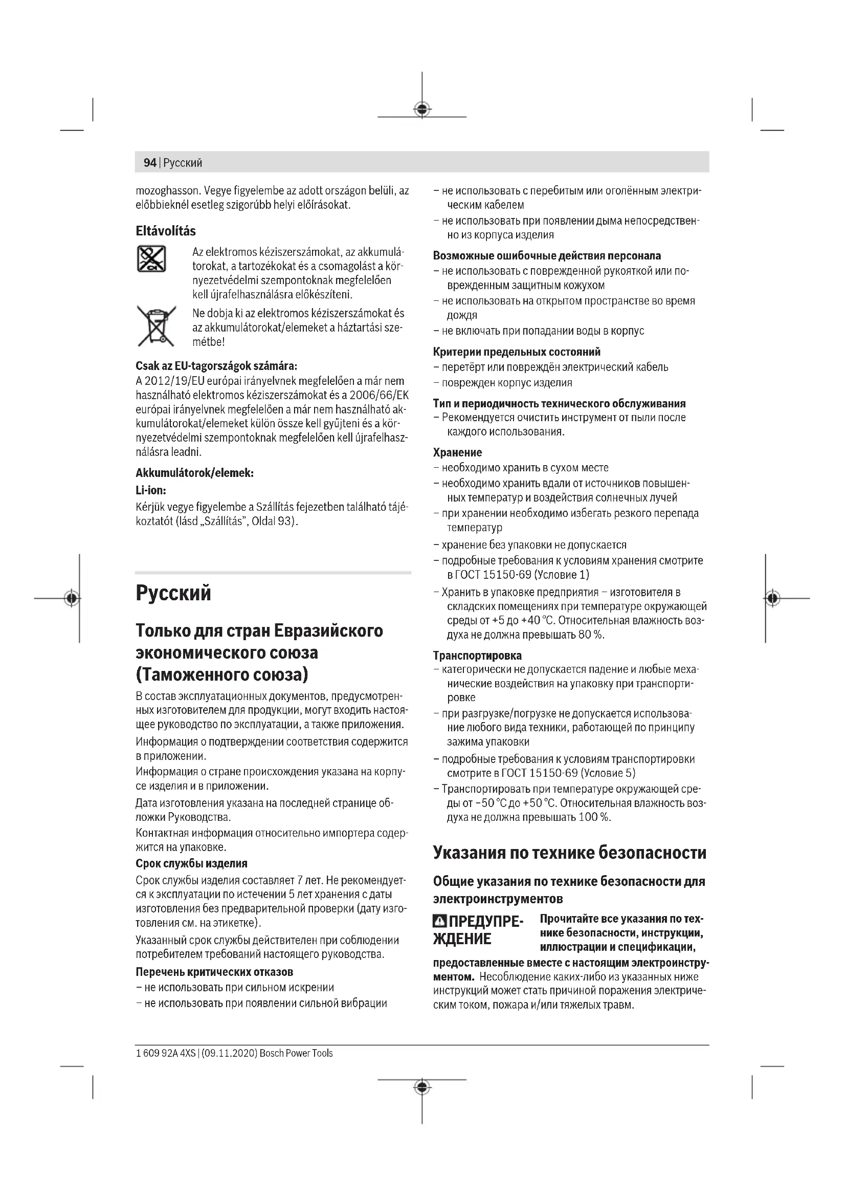 Для сверления используйте ступень «МАКС». Механический выбор передачи u Переключателем передач (4) можно пользоваться при полностью остановленном и работающем элек- троинструменте. Этого нельзя делать при полной нагрузке или на максимальных оборотах. Передача I: Диапазон низкого числа оборотов для работы со сверла- ми с большими диаметрами или для завинчивания вин- тов/шурупов. Передача II: Bosch Power Tools 1 609 92A 4XS | (09.11.2020)100 | Русский Диапазон высокого числа оборотов для работы со свер- лами небольшого диаметра. Термическая защита от перегрузки При использовании электроинструмента по назначению его перегрузка невозможна. При слишком сильной на- грузке или превышении допустимой рабочей температу- ры аккумулятора электроника отключает электроинстру- мент до тех пор, пока он снова не вернется в оптималь- ный температурный диапазон. Указания по применению u Устанавливайте электроинструмент на винт или гайку только в выключенном состоянии. Вращаю- щиеся рабочие инструменты могут соскользнуть. После продолжительной работы на малых оборотах элек- троинструмент для охлаждения требуется включить прибл. на 3 мин. на холостой ход с максимальным чис- лом оборотов. Техобслуживание и сервис Техобслуживание и очистка u До начала работ по техобслуживанию, смене инструмента и т.д., а также при транспортировке и хранении извлекайте аккумулятор из элек- троинструмента. При непреднамеренном включении возникает опасность травмирования. u Для обеспечения качественной и безопасной рабо- ты содержите электроинструмент и вентиляцион- ные прорези в чистоте. Реализацию продукции разрешается производить в мага- зинах, отделах (секциях), павильонах и киосках, обеспе- чивающих сохранность продукции, исключающих попа- дание на неё атмосферных осадков и воздействие источ- ников повышенных температур (резкого перепада темпе- ратур), в том числе солнечных лучей. Продавец (изготовитель) обязан предоставить покупате- лю необходимую и достоверную информацию о продук- ции, обеспечивающую возможность её правильного вы- бора. Информация о продукции в обязательном порядке должна содержать сведения, перечень которых установ- лен законодательством Российской Федерации. Если приобретаемая потребителем продукция была в употреблении или в ней устранялся недостаток (недостат- ки), потребителю должна быть предоставлена информа- ция об этом. В процессе реализации продукции должны выполняться следующие требования безопасности: – Продавец обязан довести до сведения покупателя фирменное наименование своей организации, место её нахождения (адрес) и режим её работы; – Образцы продукции в торговых помещениях должны обеспечивать возможность ознакомления покупателя с надписями на изделиях и исключать любые самосто- ятельные действия покупателей с изделиями, приво- дящие к запуску изделий, кроме визуального осмотра; – Продавец обязан довести до сведения покупателя ин- формацию о подтверждении соответствия этих изде- лий установленным требованиям, о наличии сертифи- катов или деклараций о соответствии; – Запрещается реализация продукции при отсутствии (утрате) её идентификационных признаков, с истёк- шим сроком годности, следами порчи и без инструк- ции (руководства) по эксплуатации, обязательного сертификата соответствия либо знака соответствия. Сервис и консульти