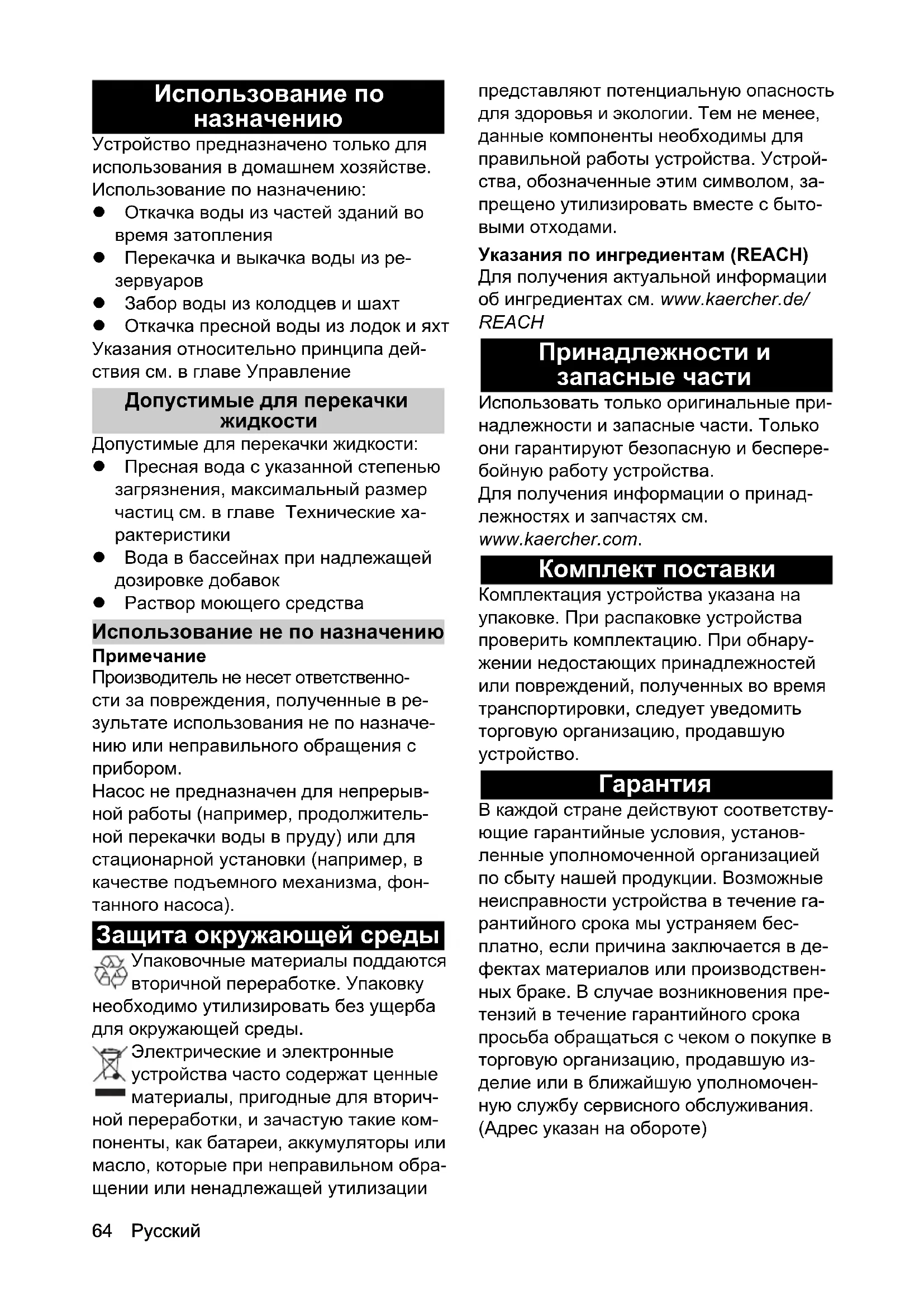 Насос не предназначен для непрерыв- ной работы (например, продолжитель- ной перекачки воды в пруду) или для стационарной установки (например, в качестве подъемного механизма, фон- танного насоса). Защита окружающей среды Упаковочные материалы поддаются вторичной переработке. Упаковку необходимо утилизировать без ущерба для окружающей среды. Электрические и электронные устройства часто содержат ценные материалы, пригодные для вторич- ной переработки, и зачастую такие ком- поненты, как батареи, аккумуляторы или масло, которые при неправильном обра- щении или ненадлежащей утилизации представляют потенциальную опасность для здоровья и экологии. Тем не менее, данные компоненты необходимы для правильной работы устройства. Устрой- ства, обозначенные этим символом, за- прещено утилизировать вместе с быто- выми отходами. Указания по ингредиентам (REACH) Для получения актуальной информации об ингредиентах см. www.kaercher.de/ REACH Принадлежности и запасные части Использовать только оригинальные при- надлежности и запасные части. Только они гарантируют безопасную и беспере- бойную работу устройства. Для получения информации о принад- лежностях и запчастях см. www.kaercher.com. Комплект поставки Комплектация устройства указана на упаковке. При распаковке устройства проверить комплектацию. При обнару- жении недостающих принадлежностей или повреждений, полученных во время транспортировки, следует уведомить торговую организацию, продавшую устройство.