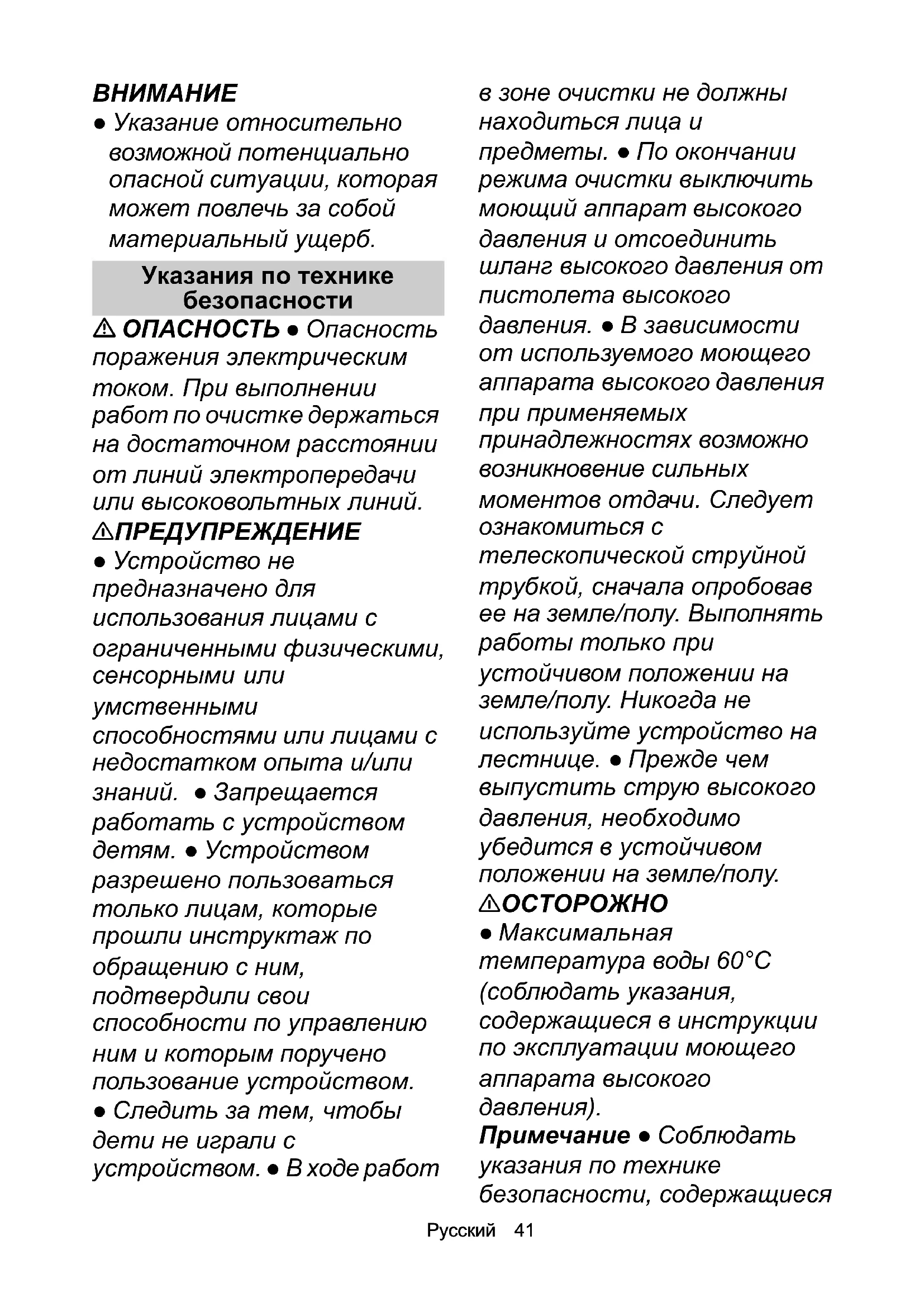 умственными способностями или лицами с недостатком опыта и/или знаний. ● Запрещается работать с устройством детям. ● Устройством разрешено пользоваться только лицам, которые прошли инструктаж по обращению с ним, подтвердили свои способности по управлению ним и которым поручено пользование устройством. ● Следить за тем, чтобы дети не играли с устройством. ● В ходе работ в зоне очистки не должны находиться лица и предметы. ● По окончании режима очистки выключить моющий аппарат высокого давления и отсоединить шланг высокого давления от пистолета высокого давления. ● В зависимости от используемого моющего аппарата высокого давления при применяемых принадлежностях возможно возникновение сильных моментов отдачи. Следует ознакомиться с телескопической струйной трубкой, сначала опробовав ее на земле/полу. Выполнять работы только при устойчивом положении на земле/полу. Никогда не используйте устройство на лестнице. ● Прежде чем выпустить струю высокого давления, необходимо убедится в устойчивом положении на земле/полу. 몇 ОСТОРОЖНО ● Максимальная температура воды 60°C (соблюдать указания, содержащиеся в