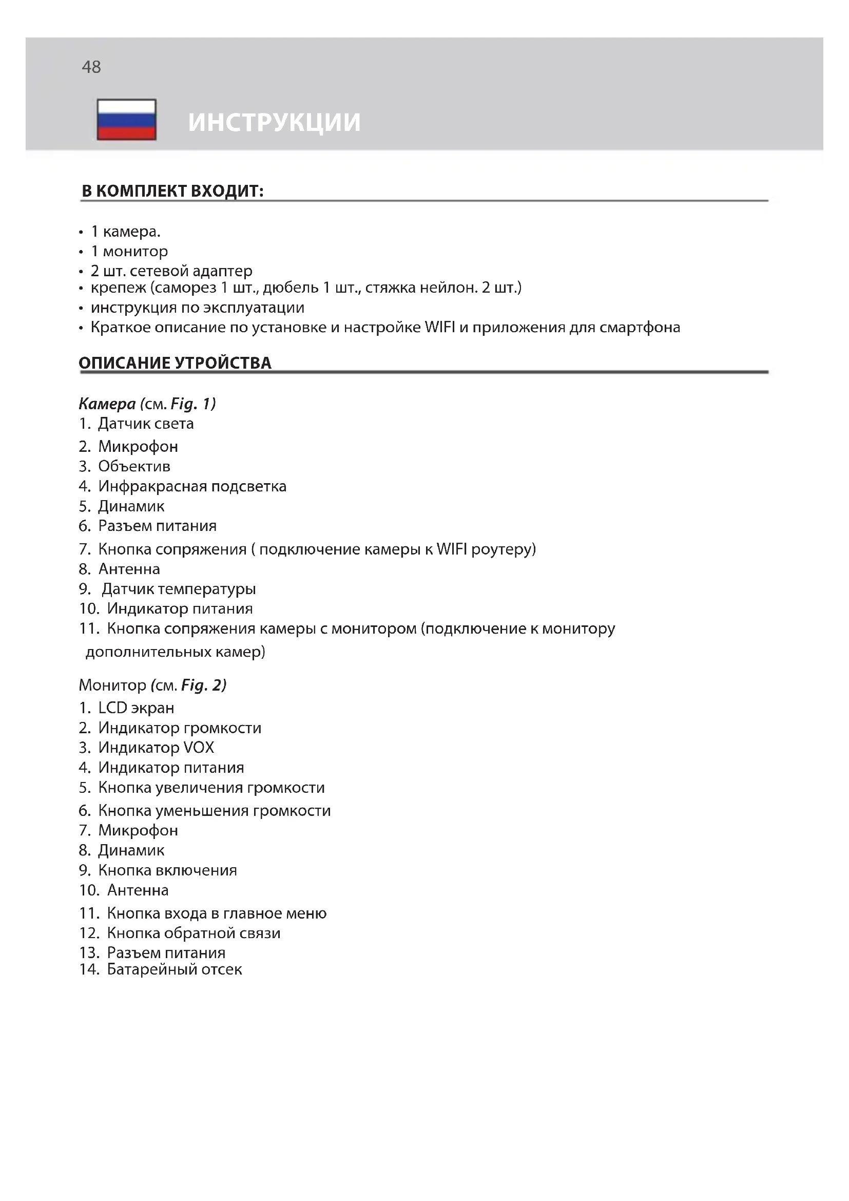 ВКЛЮЧЕНИЕ УСТРОЙСТВА1. УСТАНОВКА И ПОДКЛЮЧЕНИЕ МОНИТОРА И КАМЕРЫ1.1 Подключение питания к камереПодключите сетевой адаптер к сетевой розетке, а провод со штекером от адаптера к разъему питания на задней панели камеры. Камера автоматически включится (см. рис. 3).Примечание: для питания камеры используйте сетевой адаптер с надписью OUTPUT: 5V DC 2.0A.1.2 Установка камерыУстановите камеру в удобном месте, направьте объектив в сторону зоны наблюдения.Примечание: не поворачивайте камеру вручную! Вращать головку камеры следует только через меню монитора (см. рис. 11).1.3 Инфракрасная подсветка Камера оснащена 8 ИК-диодами высокой интенсивности для получения четкого изображения в темноте. В темноте ИК-подсветка включается автоматически.1.4 Датчик температурыДатчик температуры, установленный в камере, измеряет температуру окружающей среды в помещении, значение которой отображаются на экране монитора.1.5 Подключение питания к мониторуМонитор оснащен встроенным аккумулятором 3.7V 2600mAh (Li-ion). Для питания и подзарядки монитора используйте сетевой адаптер.1. Подключите сетевой адаптер к розетке, а провод со штекером от адаптера к разъему питания монитора (см. рис. 4)2. Откройте батарейный отсек, расположенный на задней части монитора, под-ключите и установите батарею в отсек и закройте его.3. Сдвиньте выключатель в положение « ON» (см. рис. 4)Примечание 1: Примечание 1: Используйте адаптер с надписью OUTPUT: 5V DC 1.0 A для монитора.Примечание 2: ККогда монитор включен, индикатор питания загорится зеленым цветом. Когда батарея почти разряжена индикатор питания начнет мигать красным цветом.Когда батарея заряжается, индикатор питания будет гореть красным цветом.После того, как батарея полностью зарядилась индикатор питания погаснет (если монитор выключен)Примечание 3: “” если монитор и камера находятся слишком далеко друг от друга, то на экране монитора будет отображаться сообщение (out of range). RU50