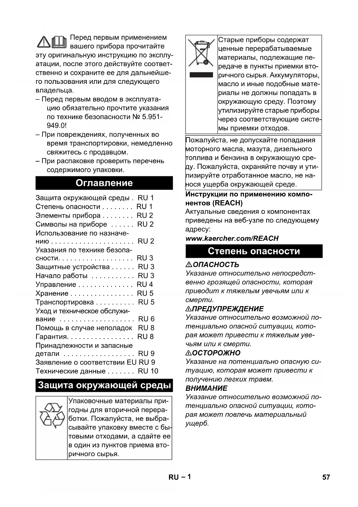 Защита окружающей среды . RU 1 Степень опасности . . . . . . . . RU 1 Элементы прибора . . . . . . . . RU 2 Символы на приборе . . . . . . RU 2 Использование по назначе- нию . . . . . . . . . . . . . . . . . . . . . RU 2 Указания по технике безопа- сности. . . . . . . . . . . . . . . . . . . RU 3 Защитные устройства . . . . . . RU 3 Начало работы . . . . . . . . . . . RU 3 Управление . . . . . . . . . . . . . . RU 4 Хранение . . . . . . . . . . . . . . . . RU 5 Транспортировка . . . . . . . . . . RU 5 Уход и техническое обслужи- вание . . . . . . . . . . . . . . . . . . . RU 6 Помощь в случае неполадок RU 8 Гарантия. . . . . . . . . . . . . . . . . RU 8 Принадлежности и запасные детали . . . . . . . . . . . . . . . . . . RU 9 Заявление о соответствии ЕU RU 9 Технические данные . . . . . . . RU 10 Защита окружающей среды Упаковочные материалы при- годны для вторичной перера- ботки. Пожалуйста, не выбра- сывайте упаковку вместе с бы- товыми отходами, а сдайте ее в один из пунктов приема вто- ричного сырья. Старые приборы содержат ценные перерабатываемые материалы, подлежащие пе- редаче в пункты приемки вто- ричного сырья. Аккумуляторы, масло и иные подобные мате- риалы не должны попадать в окружающую среду. Поэтому утилизируйте старые приборы через соответствующие систе- мы приемки отходов. Пожалуйста, не допускайте попадания моторного масла, мазута, дизельного топлива и бензина в окружающую сре- ду. Пожалуйста, охраняйте почву и ути- лизируйте отработанное масло, не на- нося ущерба окружающей среде. Степень опасности 57RU– 2 1 Плоская стопорная шайба 2 Резиновая крышка 3 Выключатель уровня 4 Топливный фильтр предваритель- ной очистки 5 Держатель для ручного пистолета- распылителя со струйной трубкой 6Рама 7 Система предохранения от отсутст-