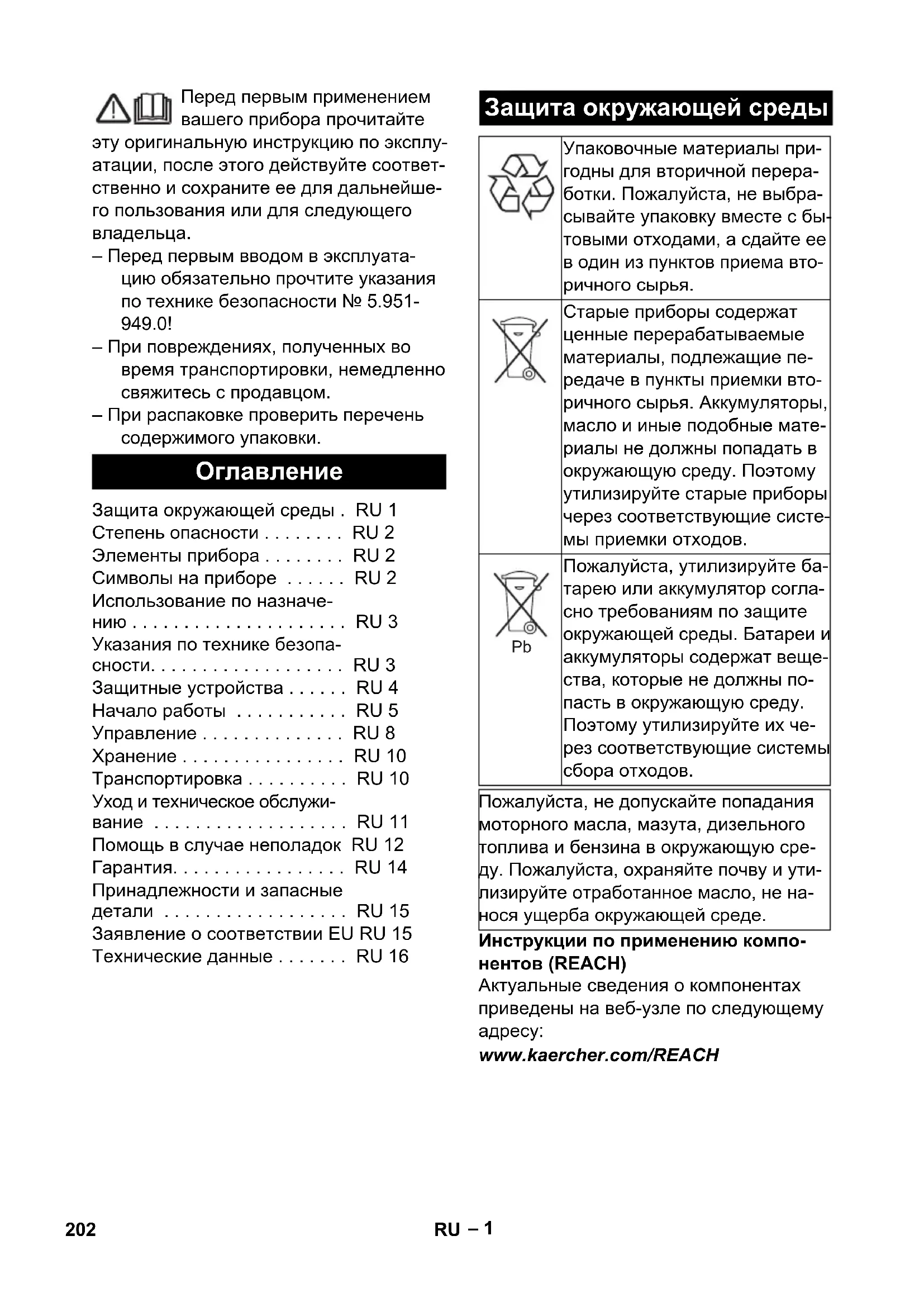 Защита окружающей среды . RU 1 Степень опасности . . . . . . . . RU 2 Элементы прибора . . . . . . . . RU 2 Символы на приборе . . . . . . RU 2 Использование по назначе- нию . . . . . . . . . . . . . . . . . . . . . RU 3 Указания по технике безопа- сности. . . . . . . . . . . . . . . . . . . RU 3 Защитные устройства . . . . . . RU 4 Начало работы . . . . . . . . . . . RU 5 Управление . . . . . . . . . . . . . . RU 8 Хранение . . . . . . . . . . . . . . . . RU 10 Транспортировка . . . . . . . . . . RU 10 Уход и техническое обслужи- вание . . . . . . . . . . . . . . . . . . . RU 11 Помощь в случае неполадок RU 12 Гарантия. . . . . . . . . . . . . . . . . RU 14 Принадлежности и запасные детали . . . . . . . . . . . . . . . . . . RU 15 Заявление о соответствии ЕU RU 15 Технические данные . . . . . . . RU 16 Защита окружающей среды Упаковочные материалы при- годны для вторичной перера- ботки. Пожалуйста, не выбра- сывайте упаковку вместе с бы- товыми отходами, а сдайте ее в один из пунктов приема вто- ричного сырья. Старые приборы содержат ценные перерабатываемые материалы, подлежащие пе- редаче в пункты приемки вто- ричного сырья. Аккумуляторы, масло и иные подобные мате- риалы не должны попадать в окружающую среду. Поэтому утилизируйте старые приборы через соответствующие систе- мы приемки отходов. Пожалуйста, утилизируйте ба- тарею или аккумулятор согла- сно требованиям по защите окружающей среды. Батареи и аккумуляторы содержат веще- ства, которые не должны по- пасть в окружающую среду. Поэтому утилизируйте их че- рез соответствующие системы сбора отходов. Пожалуйста, не допускайте попадания моторного масла, мазута, дизельного топлива и бензина в окружающую сре- ду. Пожалуйста, охраняйте почву и ути- лизируйте отработанное масло, не на- нося ущерба окружающей среде.