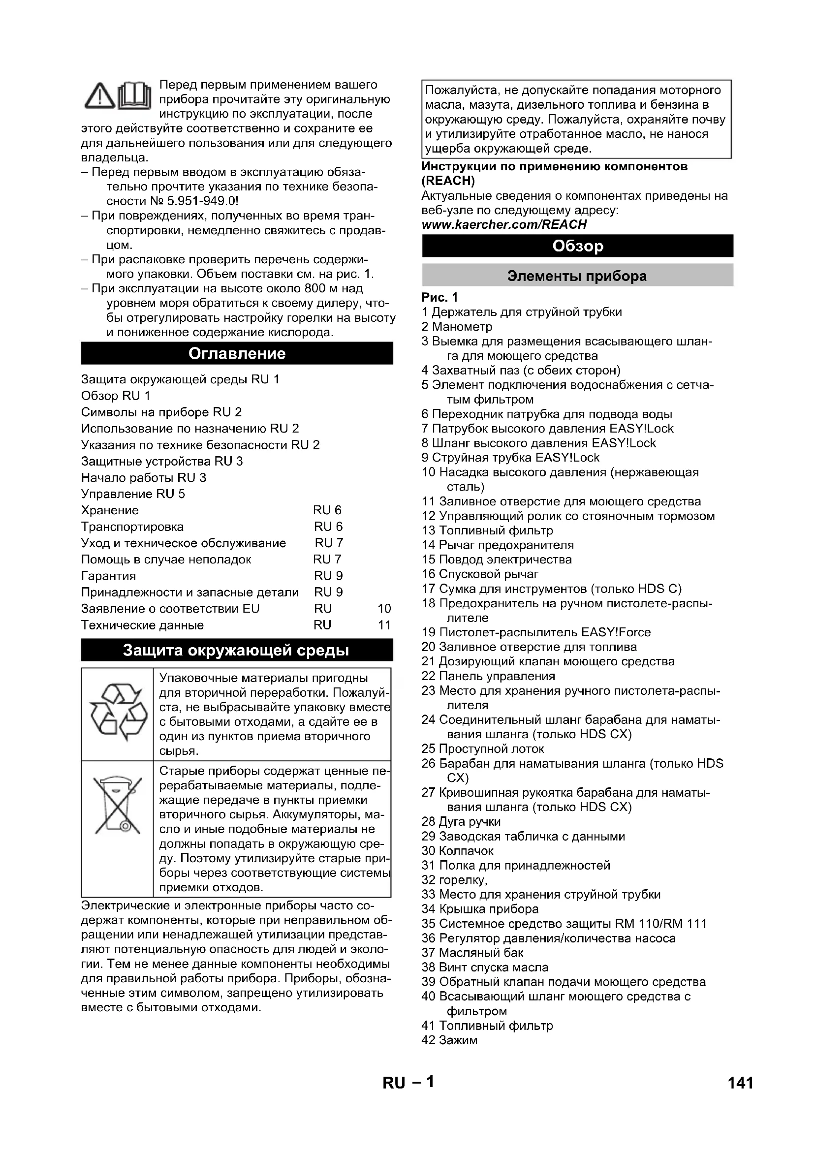 – При распаковке проверить перечень содержи- мого упаковки. Объем поставки см. на рис. 1. – При эксплуатации на высоте около 800 м над уровнем моря обратиться к своему дилеру, что- бы отрегулировать настройку горелки на высоту и пониженное содержание кислорода. Электрические и электронные приборы часто со- держат компоненты, которые при неправильном об- ращении или ненадлежащей утилизации представ- ляют потенциальную опасность для людей и эколо- гии. Тем не менее данные компоненты необходимы для правильной работы прибора. Приборы, обозна- ченные этим символом, запрещено утилизировать вместе с бытовыми отходами. Инструкции по применению компонентов (REACH) Актуальные сведения о компонентах приведены на веб-узле по следующему адресу: www.kaercher.com/REACH Рис. 1 1 Держатель для струйной трубки 2 Манометр 3 Выемка для размещения всасывающего шлан- га для моющего средства 4 Захватный паз (с обеих сторон) 5 Элемент подключения водоснабжения с сетча- тым фильтром 6 Переходник патрубка для подвода воды 7 Патрубок высокого давления EASY!Lock 8 Шланг высокого давления EASY!Lock 9 Струйная трубка EASY!Lock 10 Насадка высокого давления (нержавеющая