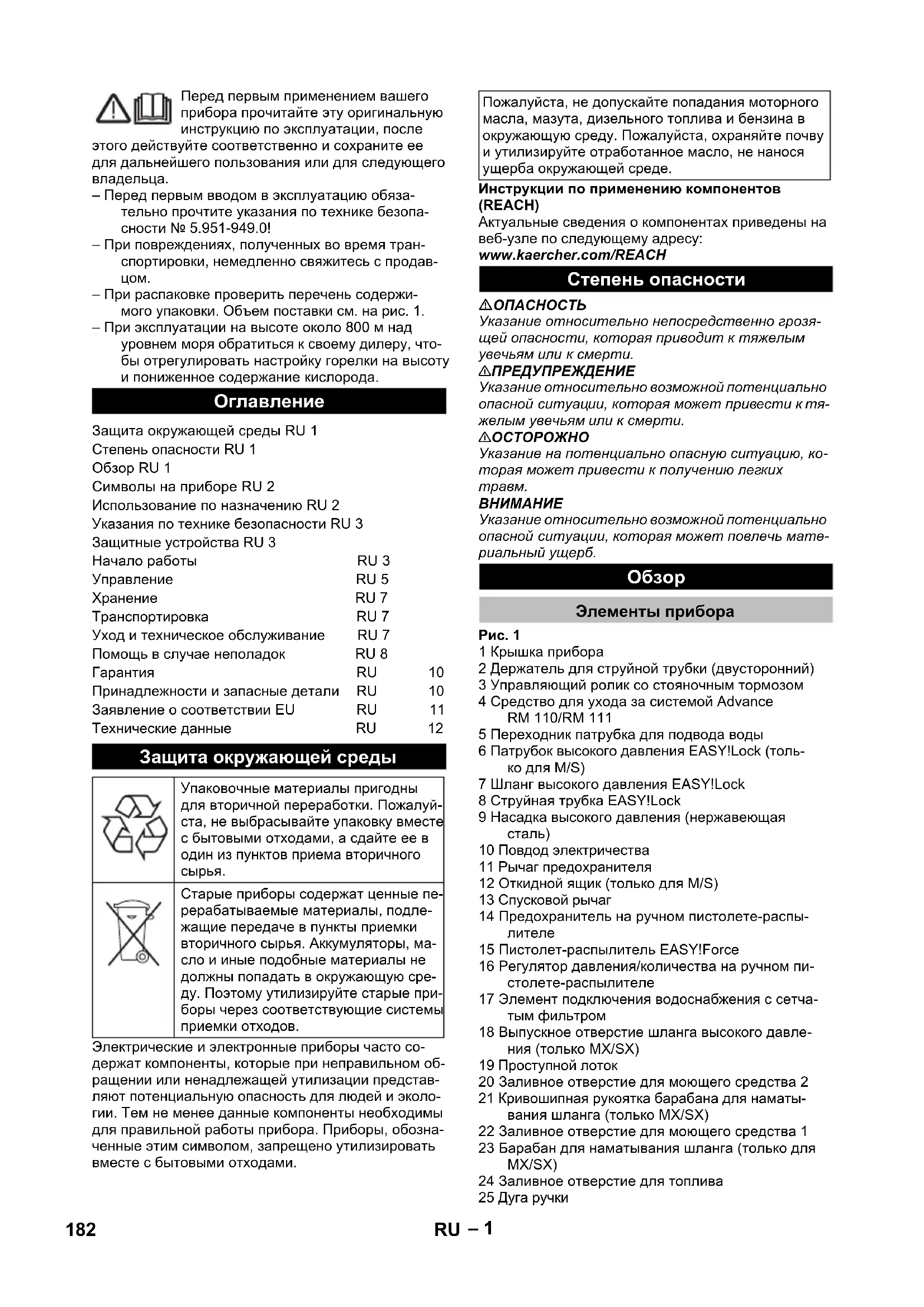 – При распаковке проверить перечень содержи- мого упаковки. Объем поставки см. на рис. 1. – При эксплуатации на высоте около 800 м над уровнем моря обратиться к своему дилеру, что- бы отрегулировать настройку горелки на высоту и пониженное содержание кислорода. Электрические и электронные приборы часто со- держат компоненты, которые при неправильном об- ращении или ненадлежащей утилизации представ- ляют потенциальную опасность для людей и эколо- гии. Тем не менее данные компоненты необходимы для правильной работы прибора. Приборы, обозна- ченные этим символом, запрещено утилизировать вместе с бытовыми отходами. Инструкции по применению компонентов (REACH) Актуальные сведения о компонентах приведены на веб-узле по следующему адресу: www.kaercher.com/REACH