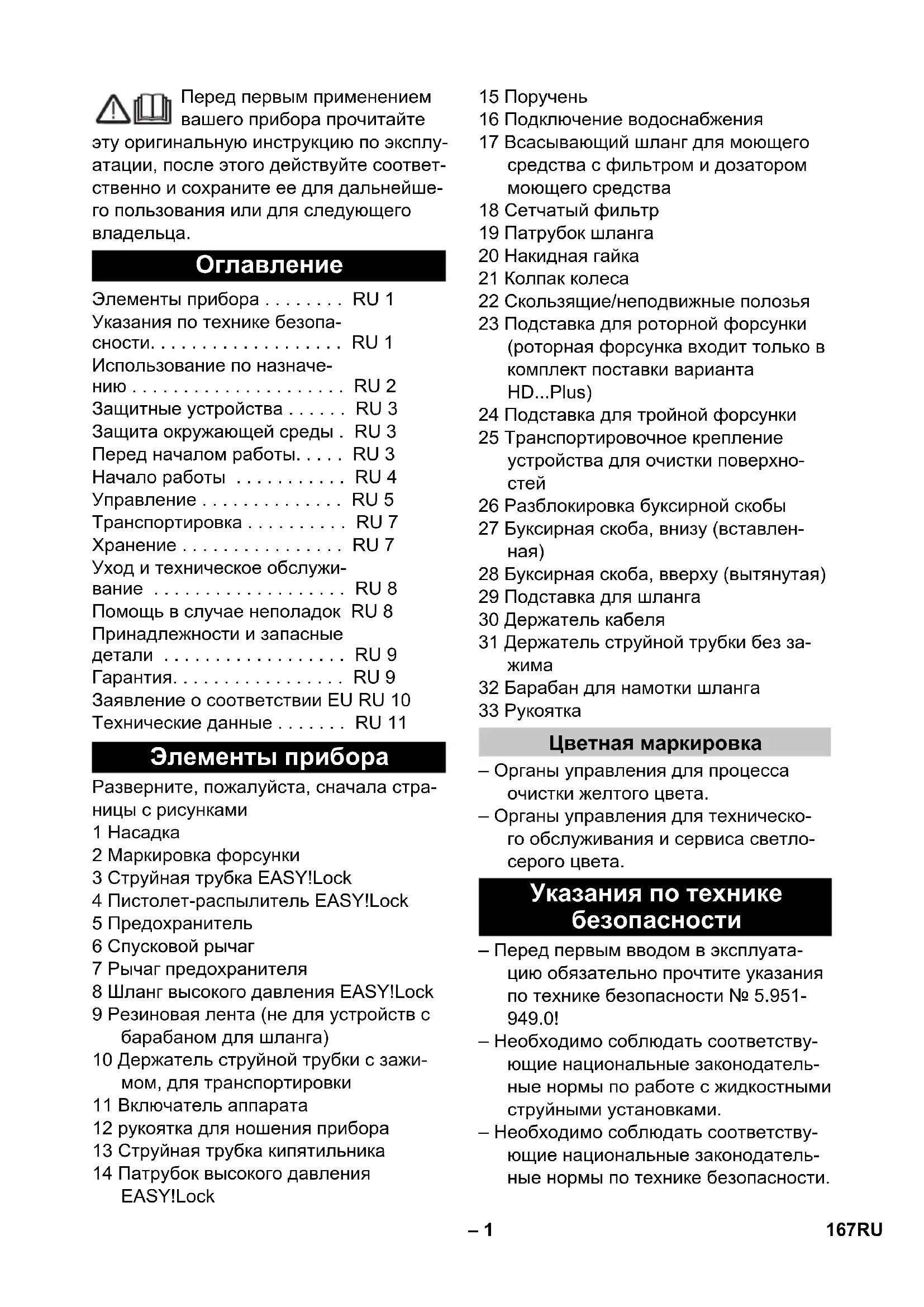 Элементы прибора . . . . . . . . RU 1 Указания по технике безопа- сности. . . . . . . . . . . . . . . . . . . RU 1 Использование по назначе- нию . . . . . . . . . . . . . . . . . . . . . RU 2 Защитные устройства . . . . . . RU 3 Защита окружающей среды . RU 3 Перед началом работы. . . . . RU 3 Начало работы . . . . . . . . . . . RU 4 Управление . . . . . . . . . . . . . . RU 5 Транспортировка . . . . . . . . . . RU 7 Хранение . . . . . . . . . . . . . . . . RU 7 Уход и техническое обслужи- вание . . . . . . . . . . . . . . . . . . . RU 8 Помощь в случае неполадок RU 8 Принадлежности и запасные детали . . . . . . . . . . . . . . . . . . RU 9 Гарантия. . . . . . . . . . . . . . . . . RU 9 Заявление о соответствии ЕU RU 10 Технические данные . . . . . . . RU 11 Элементы прибора Цветная маркировка Указания по технике безопасности 167RU– 2 Необходимо регулярно проверять работу жидкостных струйных устано- вок и результат проверки оформлять в письменном виде. – Запрещается производить какие- либо изменения устройства/принад-