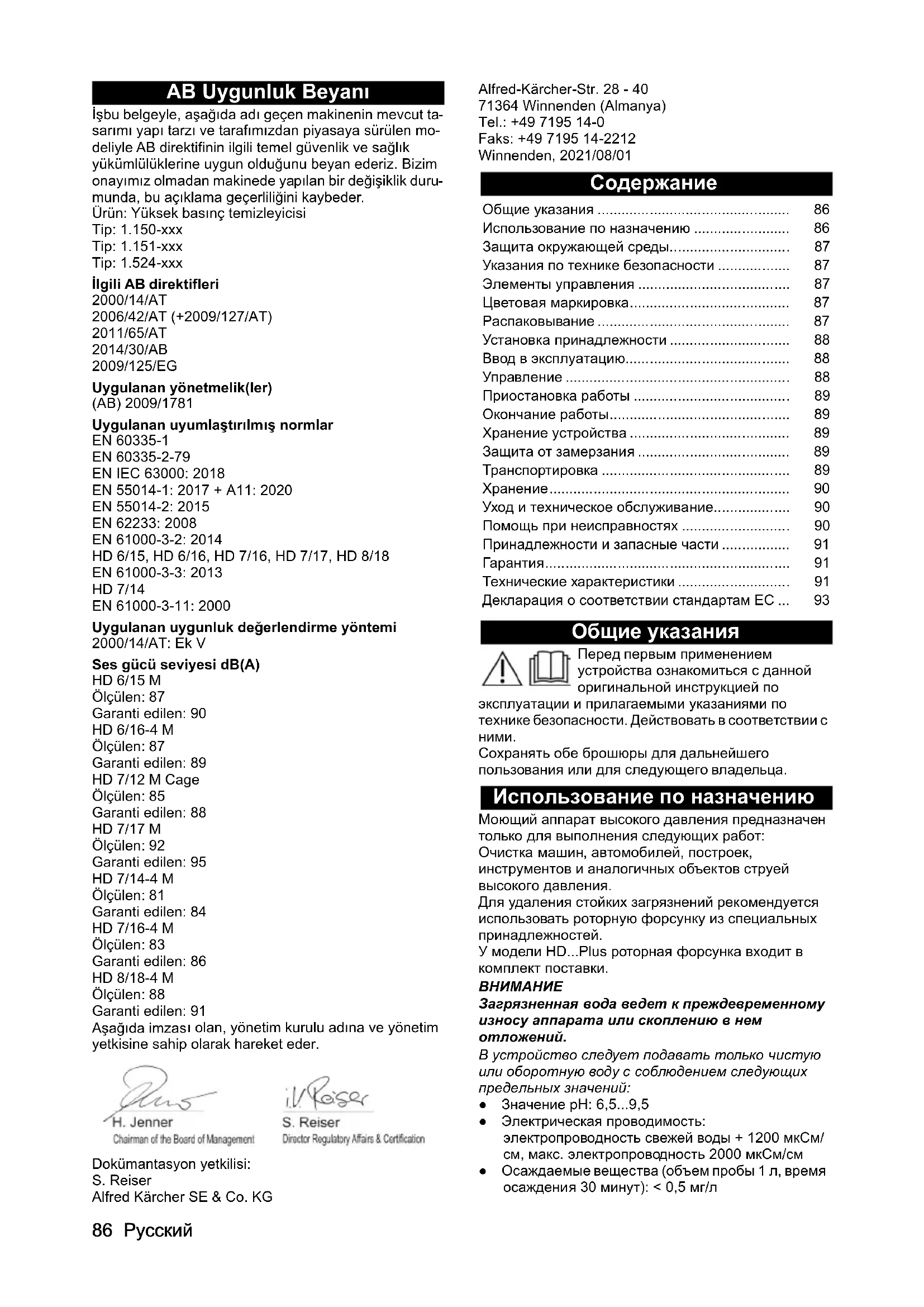 dB(A)84869592Magyar 93 Декларация о соответствии стандартам ЕС Настоящим заявляем, что концепция, конструкция и исполнение указанной ниже машины отвечают соответствующим основным требованиям директив ЕС по безопасности и охране здоровья. При любых изменениях машины, не согласованных с нашей компанией, данная декларация теряет свою силу. Изделие: Моющий аппарат высокого давления Тип: 1.150-xxx Тип: 1.151-xxx Тип: 1.524-xxx Действующие директивы ЕС 2000/14/ЕС 2006/42/ЕС (+2009/127/ЕС) 2011/65/EС 2014/30/EС 2009/125/ЕС Применяемый(-ые) регламент(-ы) (ЕС) 2009/1781 Примененные гармонизированные стандарты EN 60335-1 EN 60335-2-79 EN IEC 63000: 2018 EN 55014-1: 2017 + A11: 2020 EN 55014-2: 2015 EN 62233: 2008 EN 61000-3-2: 2014 HD 6/15, HD 6/16, HD 7/16, HD 7/17, HD 8/18 EN 61000-3-3: 2013 HD 7/14 EN 61000-3-11: 2000 Примененный метод оценки соответствия 2000/14/ЕС: Приложение V Уровень звуковой мощности дБ(A) HD 6/15 M Измерено: 87 Гарантировано: 90 HD 6/16-4 M Измерено: 87 Гарантировано: 89 HD 7/12 M Cage Измерено: 85 Гарантировано: 88 HD 7/17 M Измерено: 92 Гарантировано: 95 HD 7/14-4 M Измерено: 81 Гарантировано: 84 HD 7/16-4 M Измерено: 83 Гарантировано: 86 HD 8/18-4 M Измерено: 88 Гарантировано: 91 Нижеподписавшиеся лица действуют от имени и по доверенности Правления. Лицо, ответственное за ведение документации