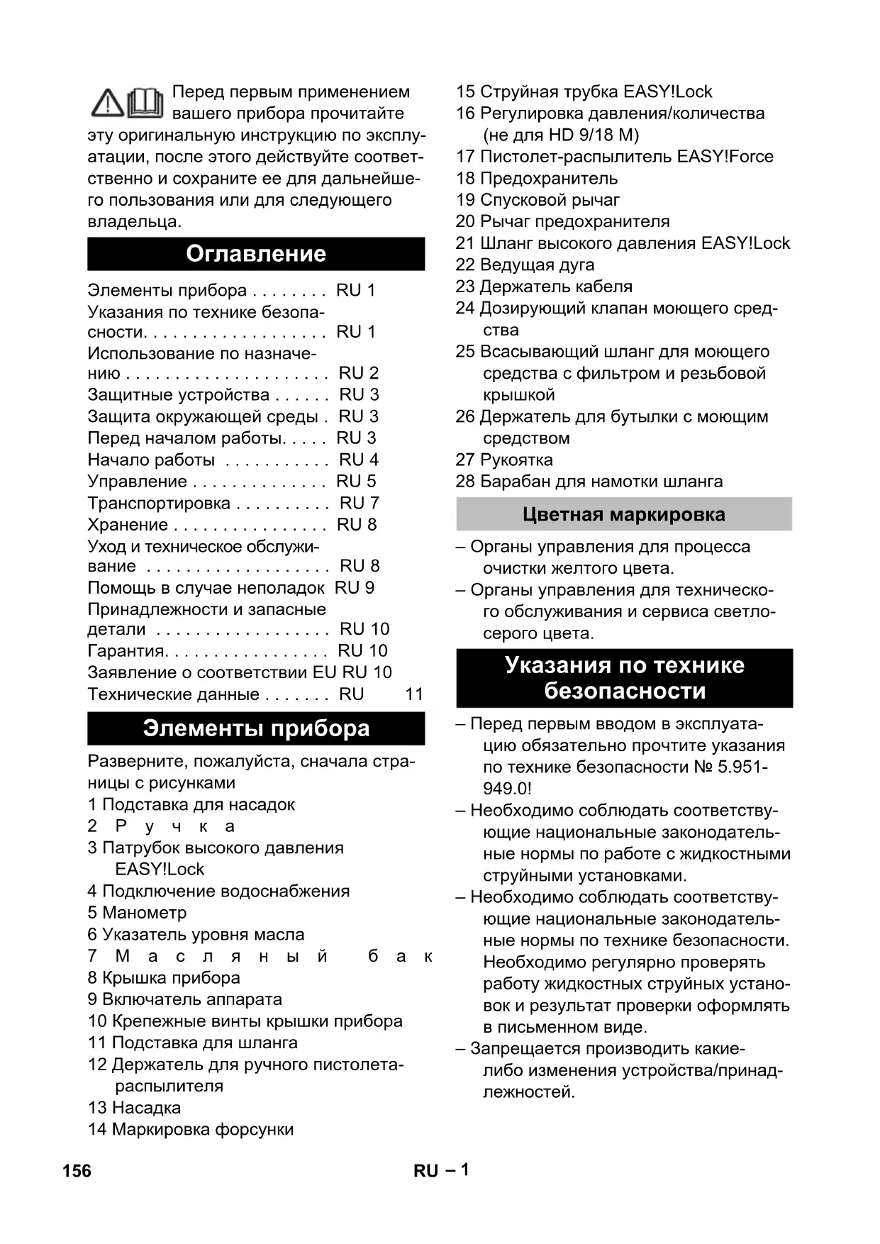 Элементы прибора . . . . . . . . RU 1 Указания по технике безопа- сности. . . . . . . . . . . . . . . . . . . RU 1 Использование по назначе- нию . . . . . . . . . . . . . . . . . . . . . RU 2 Защитные устройства . . . . . . RU 3 Защита окружающей среды . RU 3 Перед началом работы. . . . . RU 3 Начало работы . . . . . . . . . . . RU 4 Управление . . . . . . . . . . . . . . RU 5 Транспортировка . . . . . . . . . . RU 7 Хранение . . . . . . . . . . . . . . . . RU 8 Уход и техническое обслужи- вание . . . . . . . . . . . . . . . . . . . RU 8 Помощь в случае неполадок RU 9 Принадлежности и запасные детали . . . . . . . . . . . . . . . . . . RU 10 Гарантия. . . . . . . . . . . . . . . . . RU 10 Заявление о соответствии ЕU RU 10 Технические данные . . . . . . . RU 11 Элементы прибора Цветная маркировка Указания по технике безопасности 156 RU– 2