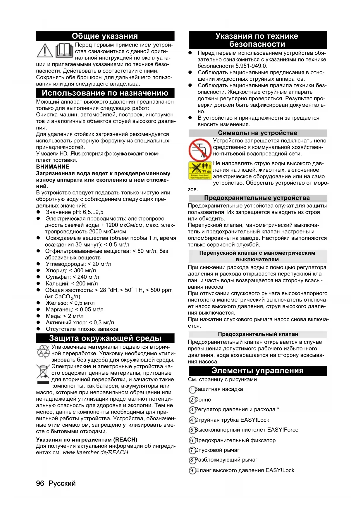 Железо: < 0,5 мг/л Марганец: < 0,05 мг/л Медь: < 2 мг/л Активный хлор: < 0,3 мг/л Отсутствие плохих запахов Защита окружающей среды Упаковочные материалы поддаются вторич- ной переработке. Упаковку необходимо утили- зировать без ущерба для окружающей среды. Электрические и электронные устройства ча- сто содержат ценные материалы, пригодные для вторичной переработки, и зачастую такие компоненты, как батареи, аккумуляторы или масло, которые при неправильном обращении или ненадлежащей утилизации представляют потенци- альную опасность для здоровья и экологии. Тем не менее, данные компоненты необходимы для пра- вильной работы устройства. Устройства, обозначен- ные этим символом, запрещено утилизировать вме- сте с бытовыми отходами. Указания по ингредиентам (REACH) Для получения актуальной информации об ингреди- ентах см. www.k aercher.de/REACH Указания по технике безопасности Перед первым использованием устройства обя- зательно ознакомиться с указаниями по технике безопасности 5.951-949.0. Соблюдать национальные предписания в отно- шении жидкостных струйных аппаратов. Соблюдать национальные правила техники без- опасности. Жидкостные струйные аппараты должны регулярно проверяться. Результат про- верки должен быть зафиксирован документаль-