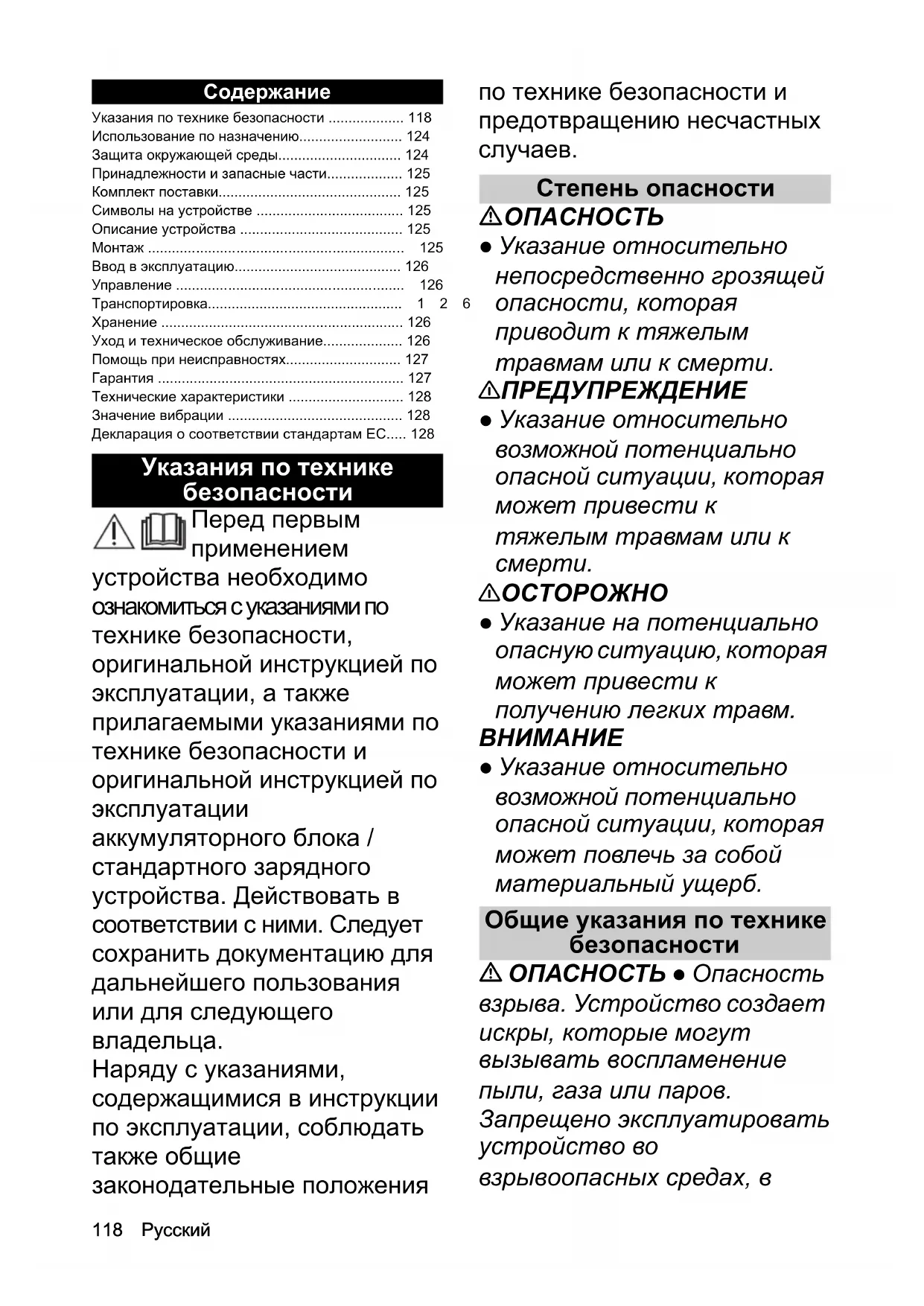 - ● Указание относительно возможной потенциально опасной ситуации, которая может повлечь за собой материальный ущерб. Общие указания по технике безопасности ОПАСНОСТЬ ● Опасность взрыва. Устройство создает искры, которые могут вызывать воспламенение пыли, газа или паров. Запрещено эксплуатировать устройство во взрывоопасных средах, в Указания по технике безопасности p. 118
