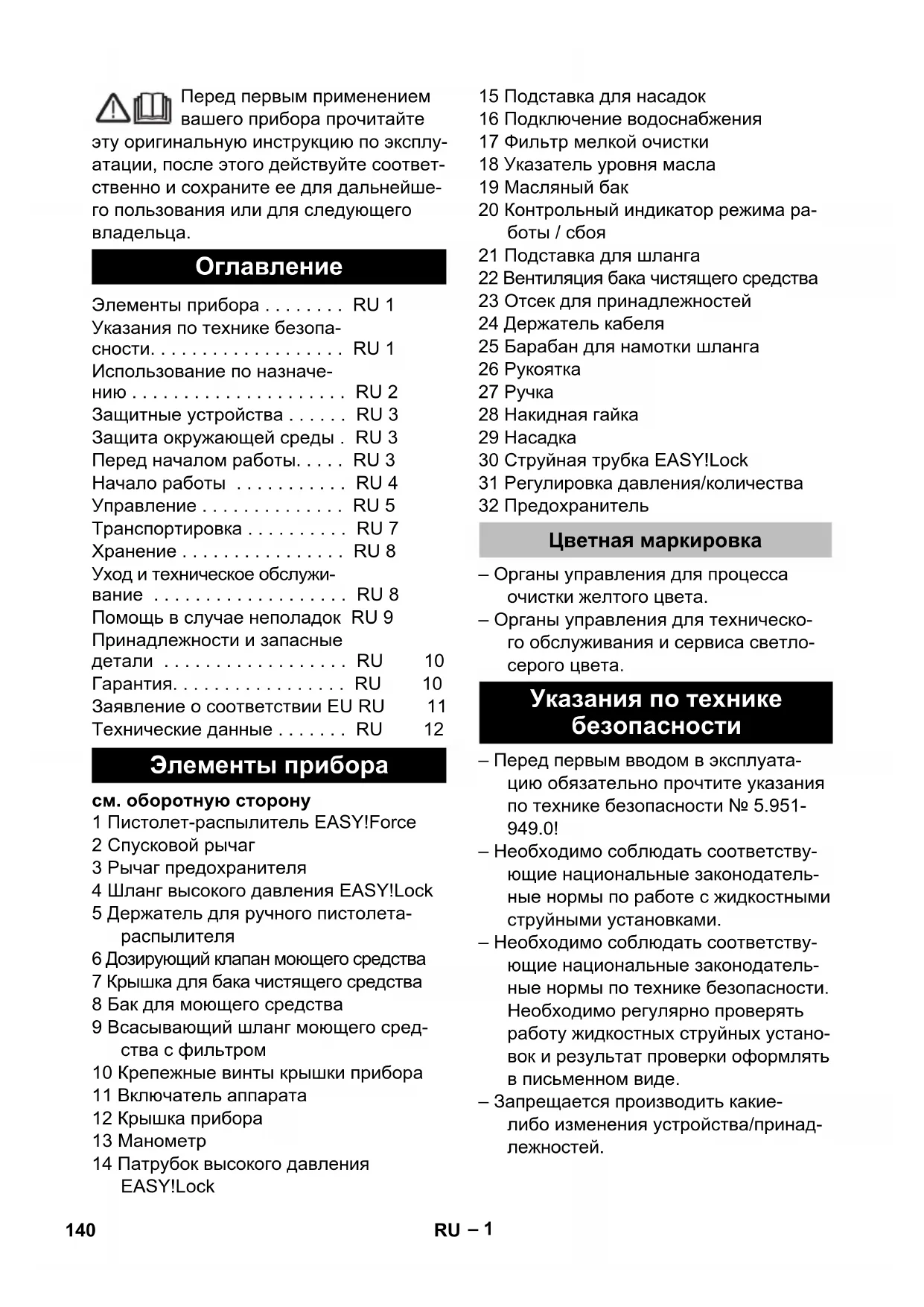 см. оборотную сторону 1 Пистолет-распылитель EASY!Force 2 Спусковой рычаг 3 Рычаг предохранителя 4 Шланг высокого давления EASY!Lock 5 Держатель для ручного пистолета- распылителя 6 Дозирующий клапан моющего средства 7 Крышка для бака чистящего средства 8 Бак для моющего средства 9 Всасывающий шланг моющего сред- ства с фильтром 10 Крепежные винты крышки прибора 11 Включатель аппарата 12 Крышка прибора 13 Манометр 14 Патрубок высокого давления EASY!Lock 15 Подставка для насадок 16 Подключение водоснабжения 17 Фильтр мелкой очистки 18 Указатель уровня масла 19 Масляный бак 20 Контрольный индикатор режима ра- боты / сбоя 21 Подставка для шланга 22 Вентиляция бака чистящего средства 23 Отсек для принадлежностей 24 Держатель кабеля 25 Барабан для намотки шланга 26 Рукоятка 27 Ручка 28 Накидная гайка 29 Насадка 30 Струйная трубка EASY!Lock 31 Регулировка давления/количества 32 Предохранитель – Органы управления для процесса очистки желтого цвета. – Органы управления для техническо- го обслуживания и сервиса светло- серого цвета. – Перед первым вводом в эксплуата- цию обязательно прочтите указания по технике безопасности № 5.951- 949.0! – Необходимо соблюдать соответству- ющие национальные законодатель- ные нормы по работе с жидкостными струйными установками. – Необходимо соблюдать соответству- ющие национальные законодатель- ные нормы по технике безопасности. Необходимо регулярно проверять работу жидкостных струйных устано- вок и результат проверки оформлять в письменном виде. – Запрещается производить какие- либо изменения устройства/принад-