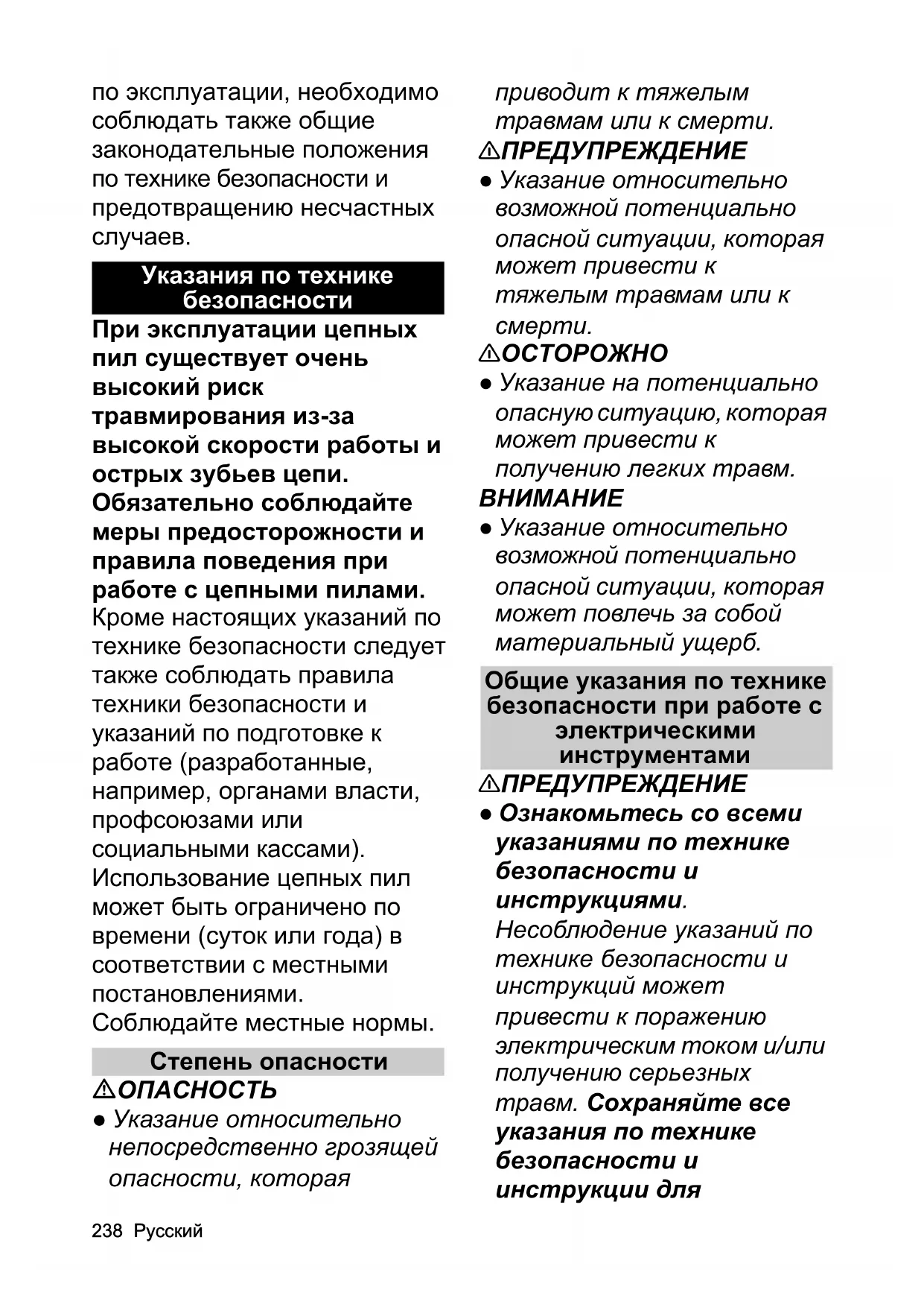 квалифицированными специалистами и только с использованием оригинальных запасных частей. Тем самым гарантируется безопасность инструмента. Дополнительные общие инструкции по безопасности Примечание ● В некоторых регионах нормативные акты могут ограничивать использование этого устройства. Для получения дополнительной информации обратитесь в местный орган власти. ОПАСНОСТЬ ● Опасность порезов в результате неконтролируемых движений устройства. Держитесь подальше от движущихся частей. ● Опасность травмирования выброшенными или падающими предметами. Никогда не используйте устройство, если в радиусе 15 м есть люди, особенно дети, или животные. ● Запрещается вносить какие-либо изменения в устройство. 몇 ПРЕДУПРЕЖДЕНИЕ ● Детям и лицам, которые не ознакомлены с этим руководством, запрещается эксплуатировать данное устройство. Местные правила могут ограничивать возраст оператора. ● Для определения возможных опасностей необходим свободный обзор рабочей зоны. Используйте устройство только при хорошем освещении. ● Перед началом работы убедитесь, что устройство, все органы управления, в том числе цепной тормоз и защитные устройства, работают исправно. Проверьте, нет ли незакрепленных крышек; удостоверьтесь в том, что все защитные устройства и ручки надежно закреплены надлежащим способом. Не используйте устройство, если его состояние не безупречно. ● Не эксплуатируйте устройство, если выключатель на ручке не включает или не выключает устройство надлежащим образом. ● Перед применением устройства заменить изношенные или поврежденные детали. ● Опасность отдачи из-за потери равновесия. Избегайте неестественного положения корпуса во время работы, следите заРусский 245 устойчивым положением и держите равновесие. ● Немедленно остановите устройство и проверьте на наличие повреждений или определите причину вибрации, если устройство упало, получило удар или имеет нехарактерную вибрацию. Отдайте устройство на ремонт в авторизованную сервисную службу или замените его. 몇 ОСТОРОЖНО ● Во время работы устройства пользуйтесь закрытыми защитными очками и защитными наушниками