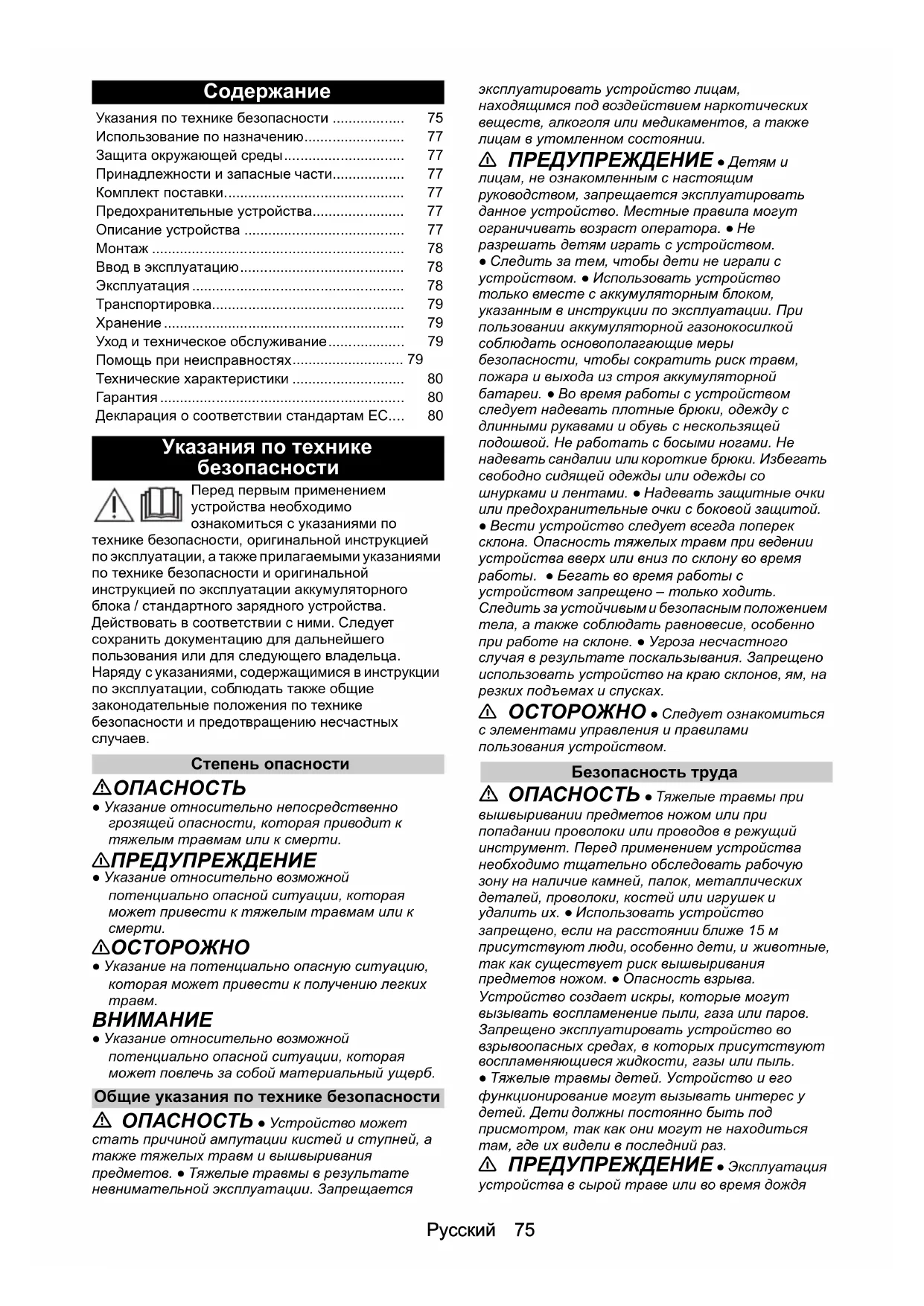 ● Указание относительно возможной потенциально опасной ситуации, которая может повлечь за собой материальный ущерб. Общие указания по технике безопасности ОПАСНОСТЬ ● Устройство может стать причиной ампутации кистей и ступней, а также тяжелых травм и вышвыривания предметов. ● Тяжелые травмы в результате невнимательной эксплуатации. Запрещается эксплуатировать устройство лицам, находящимся под воздействием наркотических веществ, алкоголя или медикаментов, а также лицам в утомленном состоянии. 몇 ПРЕДУПРЕЖДЕНИЕ ● Детям и лицам, не ознакомленным с настоящим руководством, запрещается эксплуатировать данное устройство. Местные правила могут ограничивать возраст оператора. ● Не разрешать детям играть с устройством. ● Следить за тем, чтобы дети не играли с устройством. ● Использовать устройство только вместе с аккумуляторным блоком, указанным в инструкции по эксплуатации. При пользовании аккумуляторной газонокосилкой соблюдать основополагающие меры безопасности, чтобы сократить риск травм, пожара и выхода из строя аккумуляторной батареи. ● Во время работы с устройством следует надевать плотные брюки, одежду с длинными рукавами и обувь с нескользящей подошвой. Не работать с босыми ногами. Не надевать сандалии или короткие брюки. Избегать свободно сидящей одежды или одежды со шнурками и лентами. ● Надевать защитные очки или предохранительные очки с боковой защитой. ● Вести устройство следует всегда поперек склона. Опасность тяжелых травм при ведении устройства вверх или вниз по склону во время работы. ● Бегать во время работы с устройством запрещено – только ходить. Следить за устойчивым и безопасным положением тела, а также соблюдать равновесие, особенно при работе на склоне. ● Угроза несчастного случая в результате поскальзывания. Запрещено использовать устройство на краю склонов, ям, на резких подъемах и спусках. 몇 ОСТОРОЖНО ● Следует ознакомиться с элементами управления и правилами пользования устройством. Безопасность труда ОПАСНОСТЬ ● Тяжелые травмы при вышвыривании предметов ножом или при попадании проволоки или проводов в режущий инструмент. Перед применением устройства необходимо тщательно обследовать рабочую зону на наличие камней, палок, металлических деталей, проволоки, костей или игрушек и удалить их. ● Использовать устройство запрещено, если на расстоянии ближе 15 м присутствуют люди, особенно дети, и
