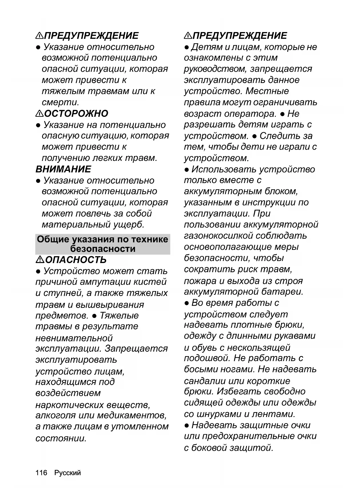 몇 ПРЕДУПРЕЖДЕНИЕ ● Детям и лицам, которые не ознакомлены с этим руководством, запрещается эксплуатировать данное устройство. Местные правила могут ограничивать возраст оператора. ● Не разрешать детям играть с устройством. ● Следить за тем, чтобы дети не играли с устройством. ● Использовать устройство только вместе с аккумуляторным блоком, указанным в инструкции по эксплуатации. При пользовании аккумуляторной газонокосилкой соблюдать основополагающие меры безопасности, чтобы сократить риск травм, пожара и выхода из строя аккумуляторной батареи. ● Во время работы с устройством следует надевать плотные брюки, одежду с длинными рукавами и обувь с нескользящей подошвой. Не работать с босыми ногами. Не надевать сандалии или короткие брюки. Избегать свободно сидящей одежды или одежды со шнурками и лентами. ● Надевать защитные очки или предохранительные очки с боковой защитой.Русский 117 ● Вести устройство следует всегда поперек склона. Опасность тяжелых травм при ведении устройства вверх или вниз по склону во время работы. ● Бегать во время работы с устройством запрещено – только ходить. Следить за устойчивым и безопасным положением тела, а также соблюдать равновесие, особенно при работе на склоне. ● Угроза несчастного