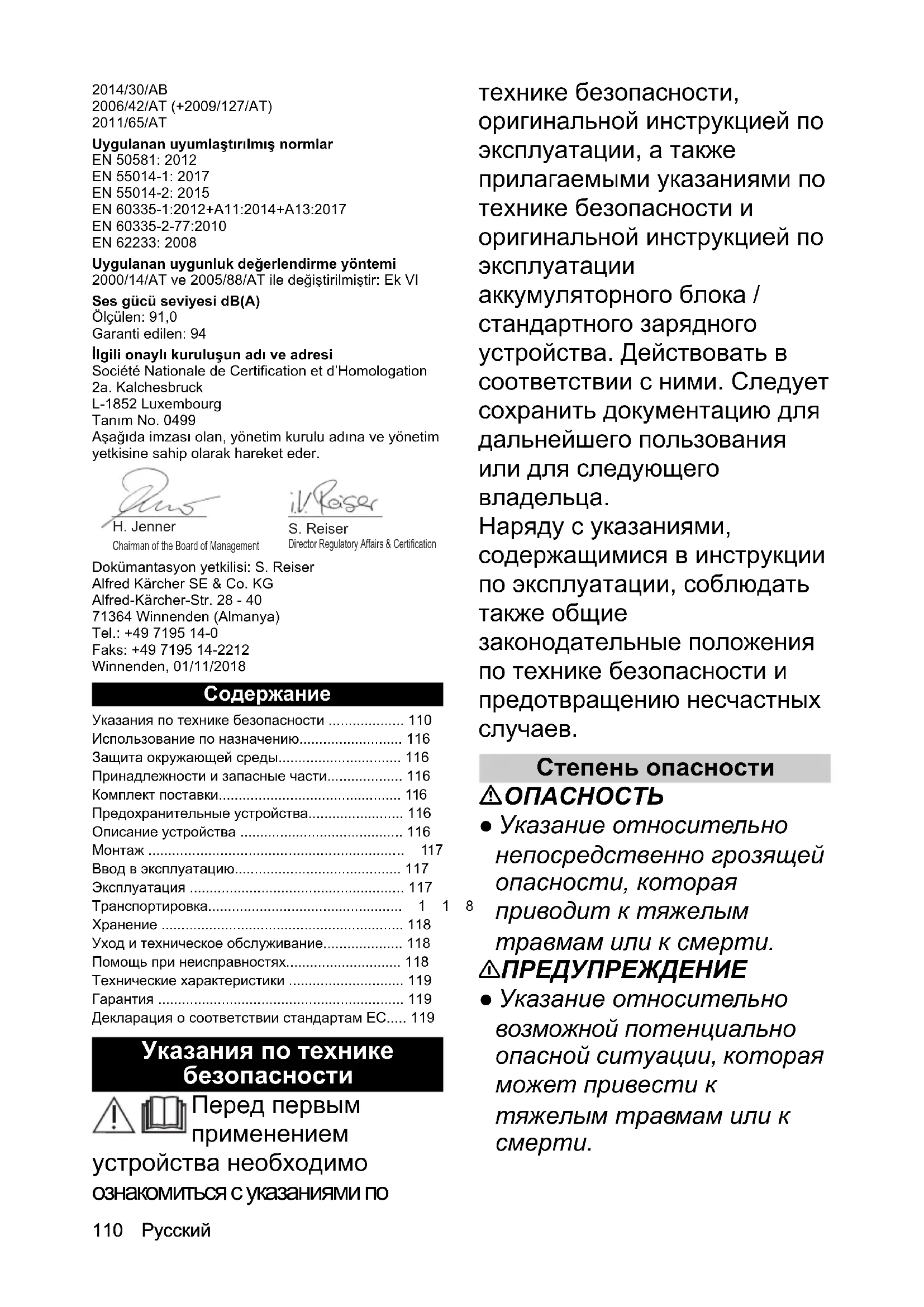 В каждой стране действуют соответствующие гарантийные условия, установленные уполномоченной организацией по сбыту нашей продукции. Возможные неисправности устройства в течение гарантийного срока мы устраняем бесплатно, если причина заключается в дефектах материалов или производственных браке. В случае возникновения претензий в течение гарантийного срока просьба обращаться с чеком о покупке в торговую организацию, продавшую изделие или в ближайшую уполномоченную службу сервисного обслуживания. (Адрес указан на обороте) Декларация о соответствии стандартам ЕС Настоящим заявляем, что концепция, конструкция и исполнение указанной ниже машины отвечают соответствующим основным требованиям директив ЕС по безопасности и охране здоровья. При любых изменениях машины, не согласованных с нашей компанией, данная декларация теряет свою силу. Изделие: аккумуляторная газонокосилка Тип: LMO 18-36 Battery 1.444-4xx.0 Действующие директивы ЕС 2000/14/ЕС (+2005/88/ЕС) 2014/30/EС 2006/42/ЕС (+2009/127/ЕС) 2011/65/EС Примененные гармонизированные стандарты EN 50581: 2012 EN 55014-1: 2017 EN 55014-2: 2015 EN 60335-1:2012+A11:2014+A13:2017 EN 60335-2-77:2010 EN 62233: 2008 Примененный метод оценки соответствия 2000/14/ЕС с изменениями 2005/88/ЕС: Приложение