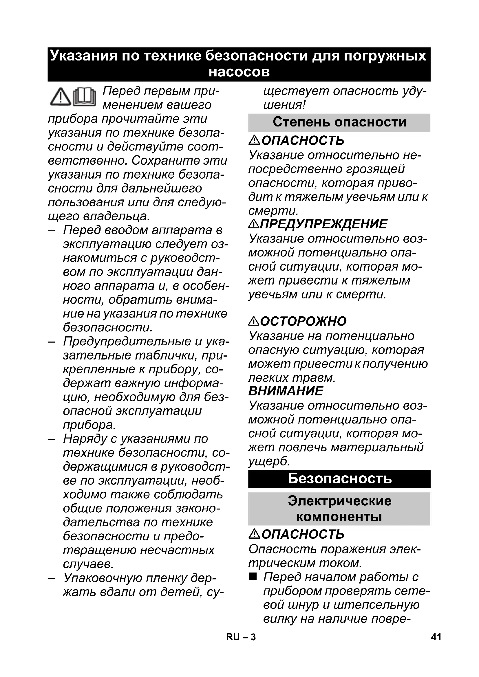 Опасность поражения элек- трическим током. Перед началом работы с прибором проверять сете- вой шнур и штепсельную вилку на наличие повре- Указания по технике безопасности для погружных