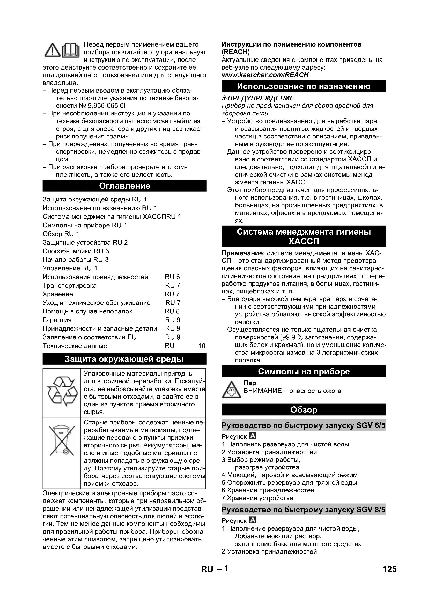 – При распаковке прибора проверьте его ком- плектность, а также его целостность. Электрические и электронные приборы часто со- держат компоненты, которые при неправильном об- ращении или ненадлежащей утилизации представ- ляют потенциальную опасность для людей и эколо- гии. Тем не менее данные компоненты необходимы для правильной работы прибора. Приборы, обозна- ченные этим символом, запрещено утилизировать вместе с бытовыми отходами. Инструкции по применению компонентов (REACH) Актуальные сведения о компонентах приведены на веб-узле по следующему адресу: www.kaercher.com/REACH 몇 ПРЕДУПРЕЖДЕНИЕ Прибор не предназначен для сбора вредной для здоровья пыли. – Устройство предназначено для выработки пара и всасывания пролитых жидкостей и твердых частиц в соответствии с описанием, приведен- ным в руководстве по эксплуатации. – Данное устройство проверено и сертифициро- вано в соответствии со стандартом ХАССП и, следовательно, подходит для тщательной гиги- енической очистки в рамках системы менед- жмента гигиены ХАССП. – Этот прибор предназначен для профессиональ- ного использования, т.е. в гостиницах, школах, больницах, на промышленных предприятиях, в магазинах, офисах и в арендуемых помещени-