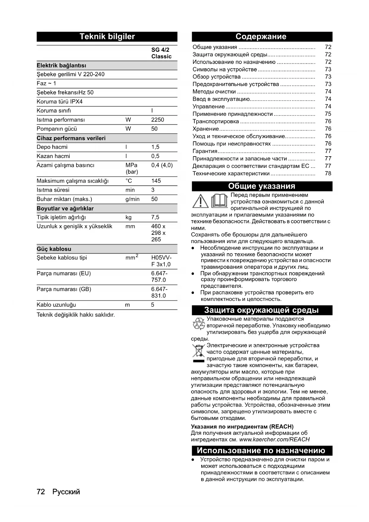 данные компоненты необходимы для правильной работы устройства. Устройства, обозначенные этим символом, запрещено утилизировать вместе с бытовыми отходами. Указания по ингредиентам (REACH) Для получения актуальной информации об ингредиентах см. www.kaercher.com/REACH Использование по назначению ● Устройство предназначено для очистки паром и может использоваться с подходящими принадлежностями в соответствии с описанием в данной инструкции по эксплуатации. SG 4/2 Classic Elektrik bağlantısı Şebeke gerilimi V 220-240 Faz ~ 1 Şebeke frekansı Hz 50 Koruma türü IPX4 Koruma sınıfı I Isıtma performansı W 2250 Pompanın gücü W 50 Cihaz performans verileri Depo hacmi l 1,5 Kazan hacmi l 0,5 Azami çalışma basıncı MPa (bar) 0,4 (4,0) Maksimum çalışma sıcaklığı °C 145 Isıtma süresi min 3 Buhar miktarı (maks.) g/min 50 Boyutlar ve ağırlıklar Tipik işletim ağırlığı kg 7,5 Uzunluk x genişlik x yükseklik mm 460 x 298 x