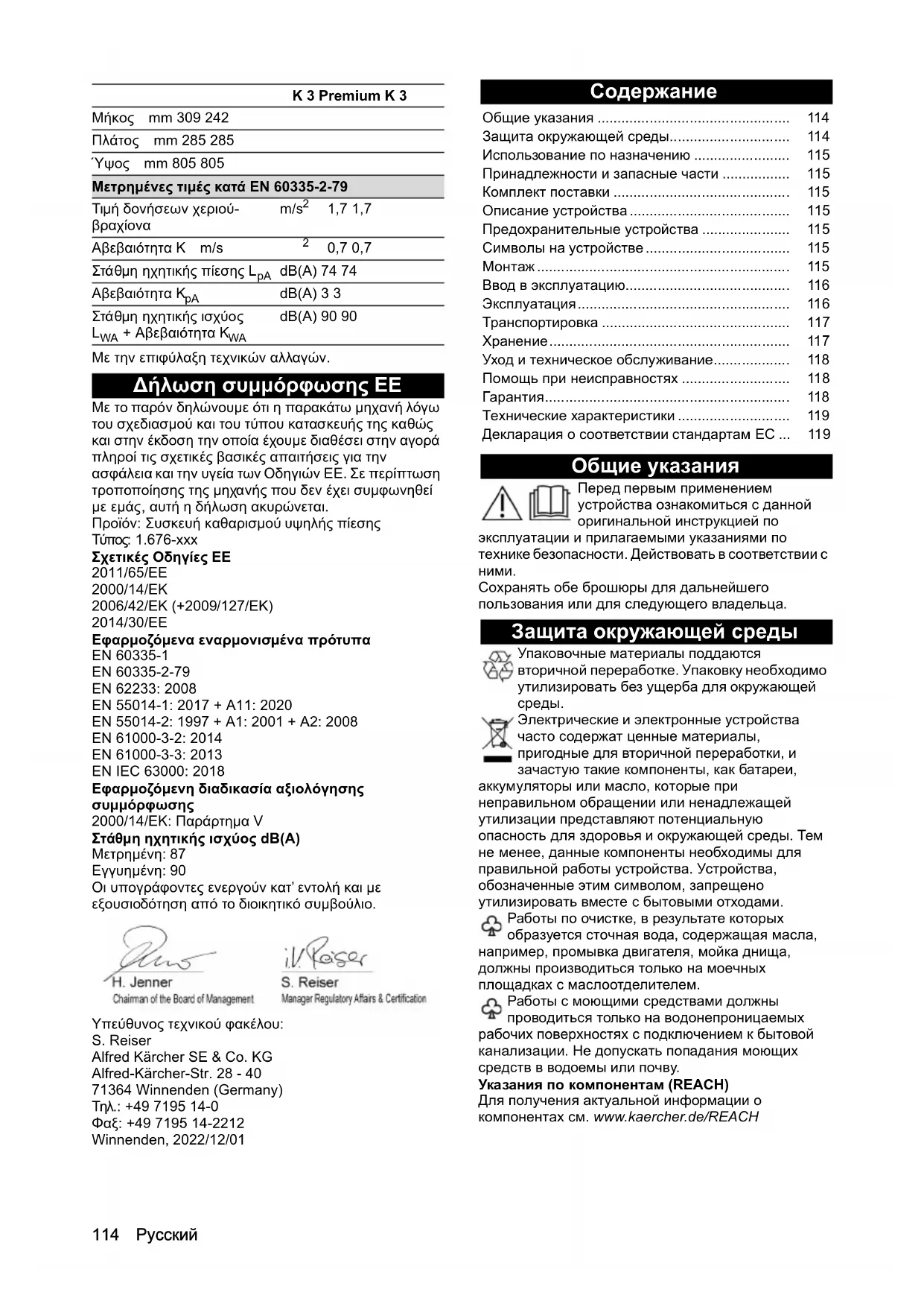 Декларация о соответствии стандартам ЕС Настоящим заявляем, что концепция, конструкция и исполнение указанной ниже машины отвечают соответствующим основным требованиям директив ЕС по безопасности и охране здоровья. При любых изменениях машины, не согласованных с нашей компанией, данная декларация теряет свою силу. Изделие: Моющий аппарат высокого давления Тип: 1.676-xxx Действующие директивы ЕС 2011/65/EС 2000/14/ЕС 2006/42/ЕС (+2009/127/ЕС) 2014/30/EС Примененные гармонизированные стандарты EN 60335-1 EN 60335-2-79 EN 62233: 2008 EN 55014-1: 2017 + A11: 2020 EN 55014-2: 1997 + A1: 2001 + A2: 2008 EN 61000-3-2: 2014 EN 61000-3-3: 2013 EN IEC 63000: 2018 Примененный метод оценки соответствия 2000/14/ЕС: Приложение V Уровень звуковой мощности дБ(A) Измерено: 87 Гарантировано: 90 Нижеподписавшиеся лица действуют от имени и по доверенности Правления. Лицо, ответственное за ведение документации: Ш. Райзер (S. Reiser) Alfred Kärcher SE & Co. KG Alfred-Kärcher-Str. 28–40 71364 Winnenden (Germany) Тел.: +49 7195 14-0 Факс: +49 7195 14-2212 г. Винненден, 2022/12/01