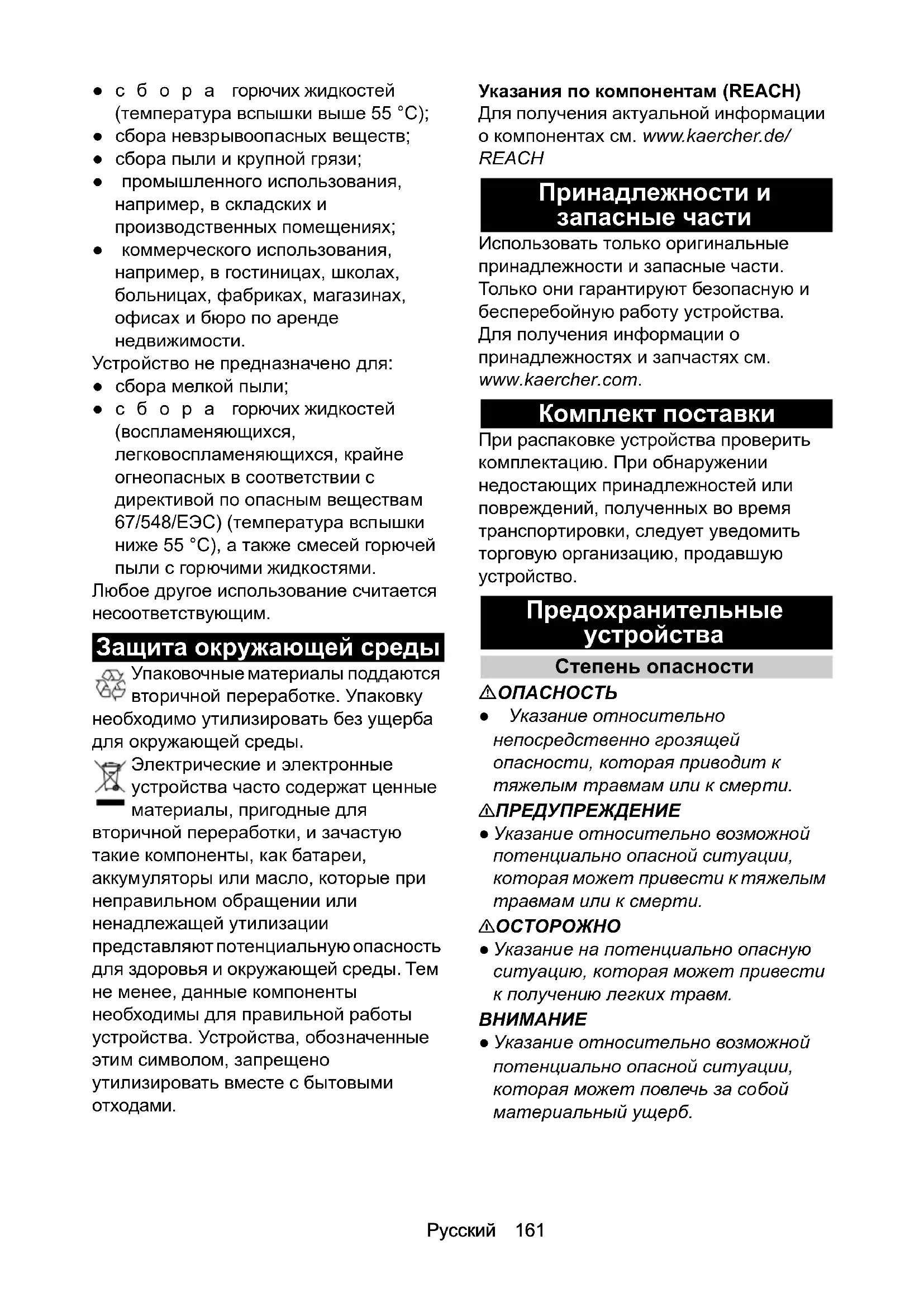 - Декларация о соответствии стандартам ЕС Русский 161 ●сбора горючих жидкостей (температура вспышки выше 55 °C); ●сбора невзрывоопасных веществ; ●сбора пыли и крупной грязи; ● промышленного использования, например, в складских и производственных помещениях; ● коммерческого использования, например, в гостиницах, школах, больницах, фабриках, магазинах, офисах и бюро по аренде недвижимости. Устройство не предназначено для: ●сбора мелкой пыли; ●сбора горючих жидкостей (воспламеняющихся, легковоспламеняющихся, крайне огнеопасных в соответствии с директивой по опасным веществам 67/548/EЭC) (температура вспышки ниже 55 °C), а также смесей горючей пыли с горючими жидкостями. Любое другое использование считается несоответствующим. Защита окружающей среды Упаковочные материалы поддаются вторичной переработке. Упаковку необходимо утилизировать без ущерба для окружающей среды. Электрические и электронные устройства часто содержат ценные материалы, пригодные для вторичной переработки, и зачастую такие компоненты, как батареи, аккумуляторы или масло, которые при неправильном обращении или ненадлежащей утилизации представляют потенциальную опасность для здоровья и окружающей среды. Тем p. 167