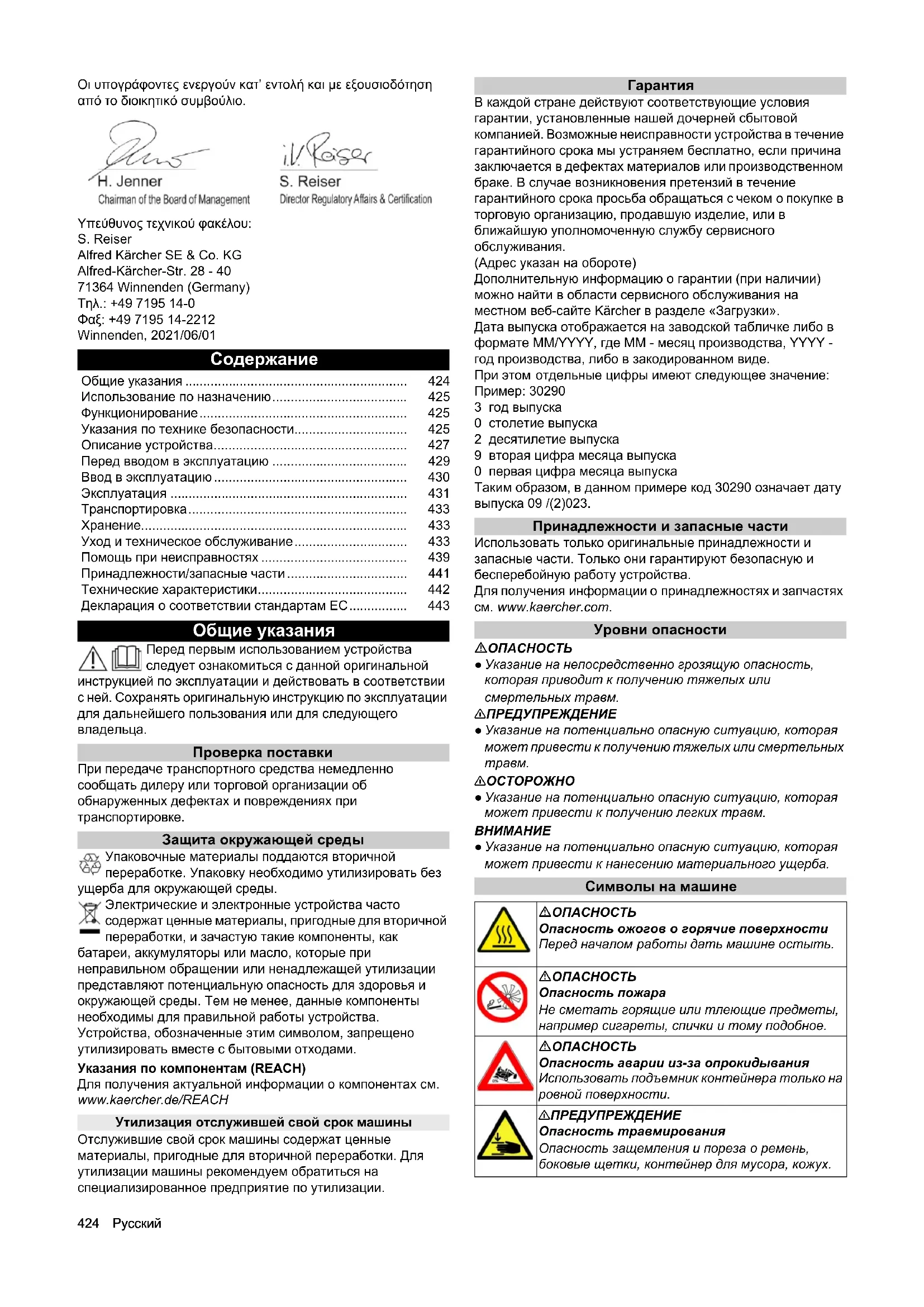 Проверка поставки При передаче транспортного средства немедленно сообщать дилеру или торговой организации об обнаруженных дефектах и повреждениях при транспортировке. Защита окружающей среды Упаковочные материалы поддаются вторичной переработке. Упаковку необходимо утилизировать без ущерба для окружающей среды. Электрические и электронные устройства часто содержат ценные материалы, пригодные для вторичной переработки, и зачастую такие компоненты, как батареи, аккумуляторы или масло, которые при неправильном обращении или ненадлежащей утилизации представляют потенциальную опасность для здоровья и окружающей среды. Тем не менее, данные компоненты необходимы для правильной работы устройства. Устройства, обозначенные этим символом, запрещено утилизировать вместе с бытовыми отходами. Указания по компонентам (REACH) Для получения актуальной информации о компонентах см. www.kaercher.de/REACH Утилизация отслужившей свой срок машины Отслужившие свой срок машины содержат ценные материалы, пригодные для вторичной переработки. Для утилизации машины рекомендуем обратиться на специализированное предприятие по утилизации.