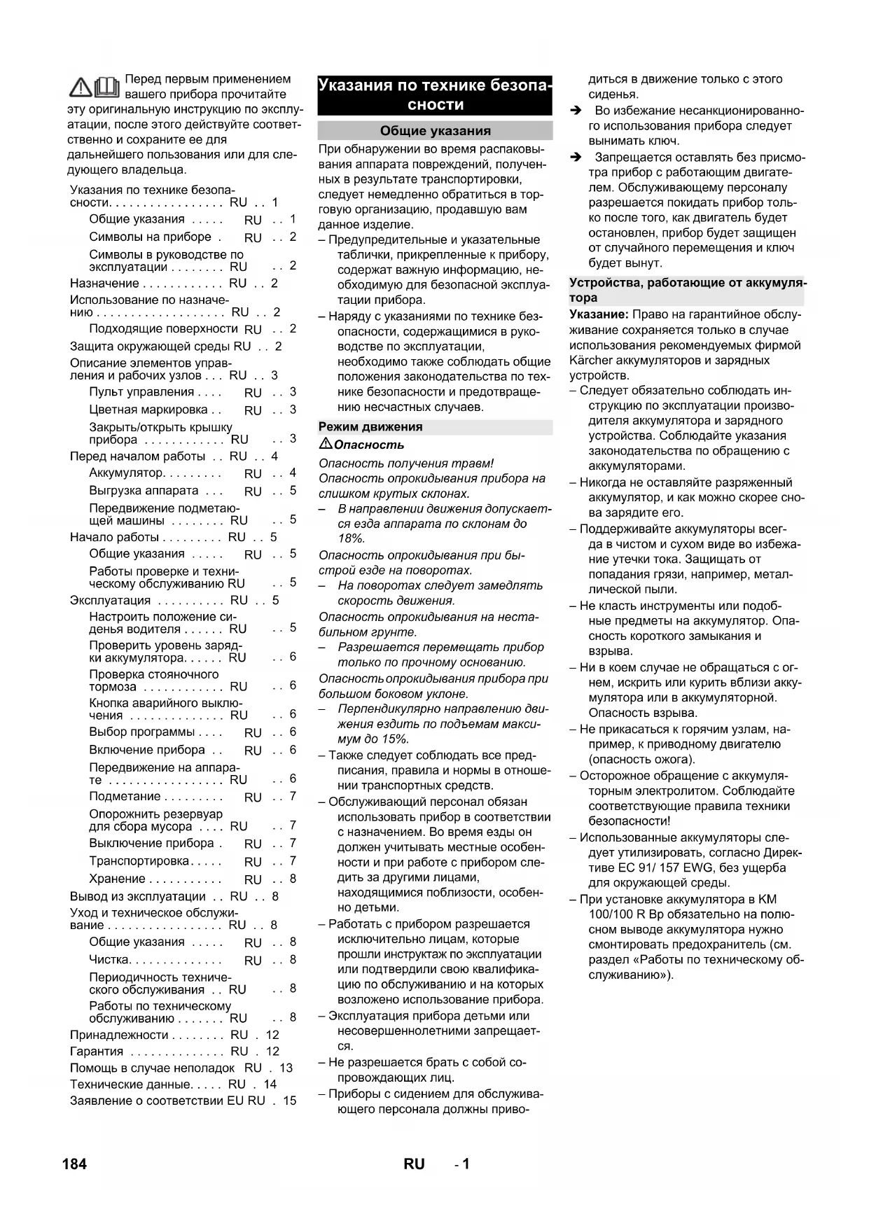 Во избежание несанкционированно- го использования прибора следует вынимать ключ. Запрещается оставлять без присмо- тра прибор с работающим двигате- лем. Обслуживающему персоналу разрешается покидать прибор толь- ко после того, как двигатель будет остановлен, прибор будет защищен от случайного перемещения и ключ будет вынут. Указание: Право на гарантийное обслу- живание сохраняется только в случае использования рекомендуемых фирмой Kärcher аккумуляторов и зарядных