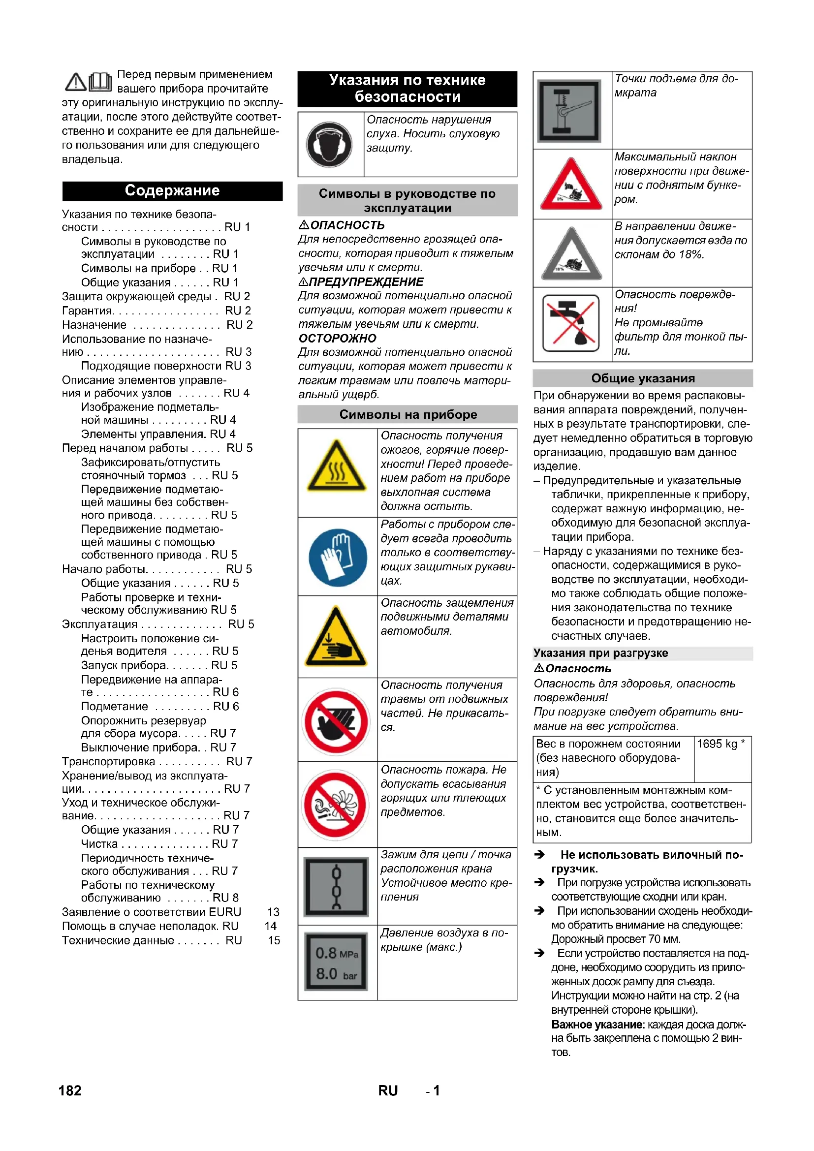 Указания по технике безопа- сности . . . . . . . . . . . . . . . . . . . RU 1 Символы в руководстве по эксплуатации . . . . . . . . RU 1 Символы на приборе . . RU 1 Общие указания . . . . . . RU 1 Защита окружающей среды . RU 2 Гарантия. . . . . . . . . . . . . . . . . RU 2 Назначение . . . . . . . . . . . . . . RU 2 Использование по назначе- нию . . . . . . . . . . . . . . . . . . . . . RU 3 Подходящие поверхности RU 3 Описание элементов управле- ния и рабочих узлов . . . . . . . RU 4 Изображение подметаль- ной машины . . . . . . . . . RU 4 Элементы управления. RU 4 Перед началом работы . . . . . RU 5 Зафиксировать/отпустить стояночный тормоз . . . RU 5 Передвижение подметаю- щей машины без собствен- ного привода. . . . . . . . . RU 5 Передвижение подметаю- щей машины с помощью собственного привода . RU 5 Начало работы. . . . . . . . . . . . RU 5 Общие указания . . . . . . RU 5 Работы проверке и техни- ческому обслуживанию RU 5 Эксплуатация . . . . . . . . . . . . . RU 5 Настроить положение си- денья водителя . . . . . . RU 5 Запуск прибора. . . . . . . RU 5 Передвижение на аппара- те . . . . . . . . . . . . . . . . . . RU 6 Подметание . . . . . . . . . RU 6 Опорожнить резервуар для сбора мусора. . . . . RU 7 Выключение прибора. . RU 7 Транспортировка . . . . . . . . . . RU 7 Хранение/вывод из эксплуата- ции. . . . . . . . . . . . . . . . . . . . . . RU 7 Уход и техническое обслужи- вание. . . . . . . . . . . . . . . . . . . . RU 7 Общие указания . . . . . . RU 7 Чистка . . . . . . . . . . . . . . RU 7 Периодичность техниче- ского обслуживания . . . RU 7 Работы по техническому обслуживанию . . . . . . . RU 8 Заявление о соответствии ЕURU 13 Помощь в случае неполадок. RU 14 Технические данные . . . . . . . RU 15 Указания по технике безопасности Опасность нарушения слуха. Носить слуховую