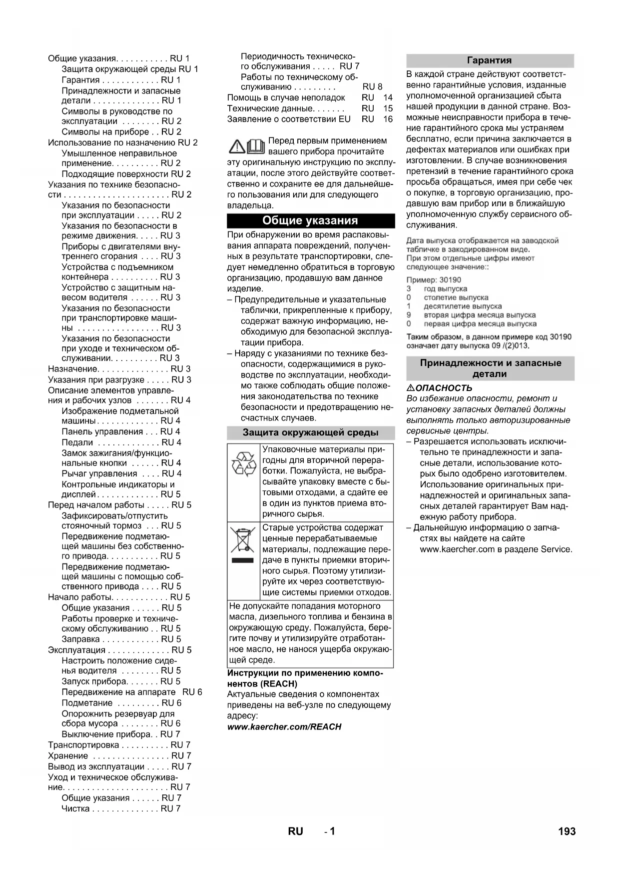 Во избежание опасности, ремонт и установку запасных деталей должны выполнять только авторизированные сервисные центры. – Разрешается использовать исключи- тельно те принадлежности и запа- сные детали, использование кото- рых было одобрено изготовителем. Использование оригинальных при- надлежностей и оригинальных запа- сных деталей гарантирует Вам над- ежную работу прибора. – Дальнейшую информацию о запча- стях вы найдете на сайте www.kaercher.com в разделе Service. Общие указания. . . . . . . . . . . RU 1 Защита окружающей среды RU 1 Гарантия . . . . . . . . . . . . RU 1 Принадлежности и запасные детали . . . . . . . . . . . . . . RU 1 Символы в руководстве по эксплуатации . . . . . . . . RU 2 Символы на приборе . . RU 2 Использование по назначению RU 2 Умышленное неправильное применение. . . . . . . . . . RU 2 Подходящие поверхности RU 2 Указания по технике безопасно- сти . . . . . . . . . . . . . . . . . . . . . . RU 2 Указания по безопасности при эксплуатации . . . . . RU 2 Указания по безопасности в режиме движения. . . . . RU 3 Приборы с двигателями вну- треннего сгорания . . . . RU 3 Устройства с подъемником контейнера . . . . . . . . . . RU 3 Устройство с защитным на- весом водителя . . . . . . RU 3 Указания по безопасности при транспортировке маши- ны . . . . . . . . . . . . . . . . . RU 3 Указания по безопасности при уходе и техническом об- служивании. . . . . . . . . . RU 3 Назначение. . . . . . . . . . . . . . . RU 3 Указания при разгрузке . . . . . RU 3 Описание элементов управле- ния и рабочих узлов . . . . . . . RU 4 Изображение подметальной машины. . . . . . . . . . . . . RU 4 Панель управления . . . RU 4 Педали . . . . . . . . . . . . . RU 4 Замок зажигания/функцио- нальные кнопки . . . . . . RU 4 Рычаг управления . . . . RU 4 Контрольные индикаторы и дисплей. . . . . . . . . . . . . RU 5 Перед началом работы . . . . . RU 5 Зафиксировать/отпустить стояночный тормоз . . . RU 5 Передвижение подметаю- щей машины без собственно- го привода. . . . . . . . . . . RU 5 Передвижение подметаю- щей машины с помощью соб- ственного привода . . . . RU 5 Начало работы. . . . . . . . . . . . RU 5 Общие указания . . . . . . RU 5 Работы проверке и техниче- скому обслуживанию . . RU 5 Заправка . . . . . . . . . . . . RU 5 Эксплуатация . . . . . . . . . . . . . RU 5 Настроить положение сиде- нья водителя . . . . . . . . RU 5 Запуск прибора. . . . . . . RU 5 Передвижение на аппарате RU 6 Подметание . . . . . . . . . RU 6 Опорожнить резервуар для сбора мусора . . . . . . . . RU 6 Выключение прибора. . RU 7 Транспортировка . . . . . . . . . . RU 7 Хранение . . . . . . . . . . . . . . . . RU 7 Вывод из эксплуатации . . . . . RU 7 Уход и техническое обслужива- ние. . . . . . . . . . . . . . . . . . . . . . RU 7 Общие указания . . . . . . RU 7 Чистка . . . . . . . . . . . . . . RU 7 Периодичность техническо- го обслуживания . . . . . RU 7 Работы по техническому об- служиванию . . . . . . . . . RU 8 Помощь в случае неполадок RU 14 Технические данные. . . . . . . RU 15 Заявление о соответствии ЕU RU 16 Общие указания Защита окружающей среды Упаковочные материалы при- годны для вторичной перера- ботки. Пожалуйста, не выбра- сывайте упаковку вместе с бы- товыми отходами, а сдайте ее в один из пунктов приема вто- ричного сырья. Старые устройства содержат ценные перерабатываемые материалы, подлежащие пере- даче в пункты приемки вторич- ного сырья. Поэтому утилизи- руйте их через соответствую- щие системы приемки отходов. Не допускайте попадания моторного масла, дизельного топлива и бензина в окружающую среду. Пожалуйста, бере- гите почву и утилизируйте отработан- ное масло, не нанося ущерба окружаю-