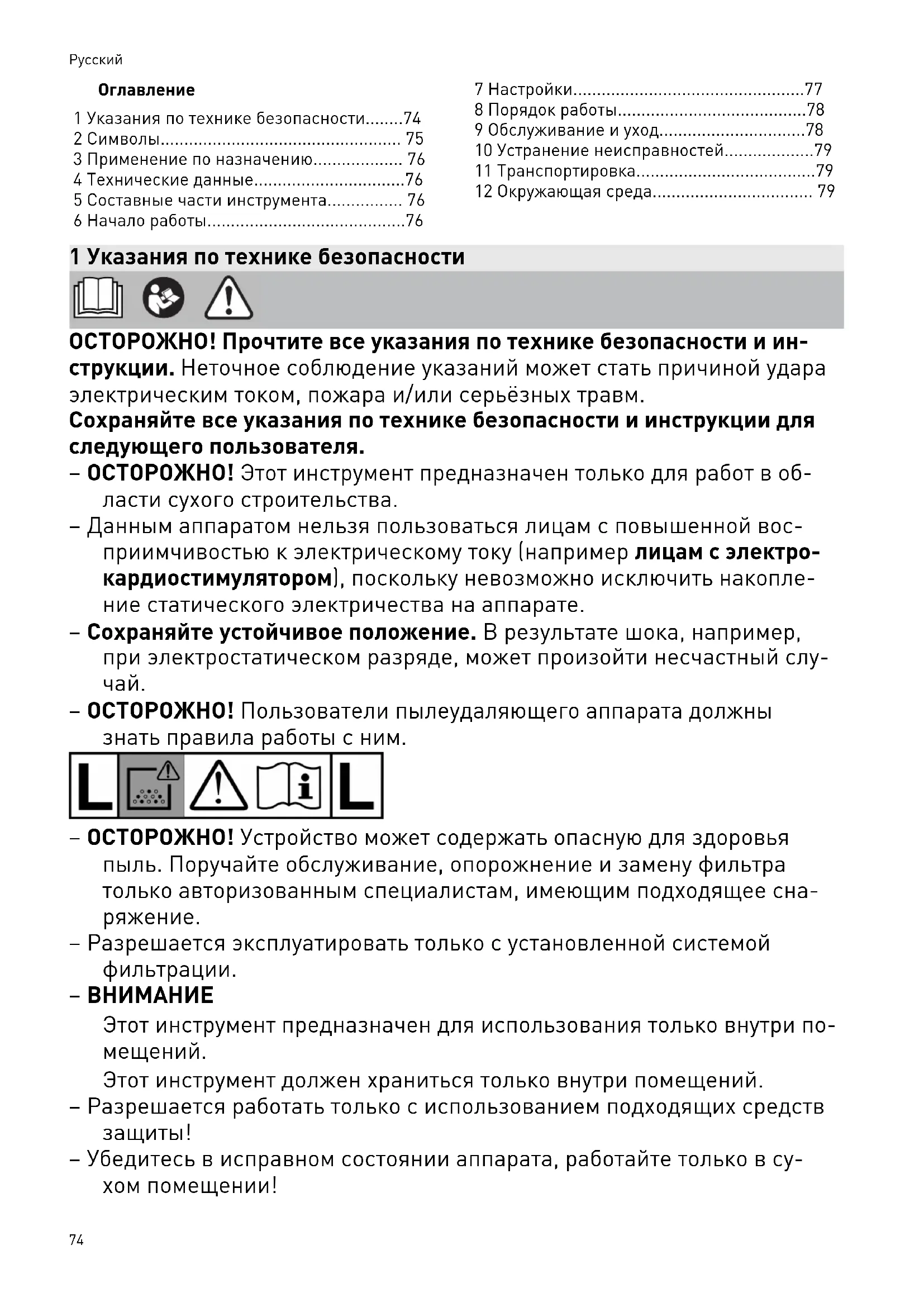 – ОСТОРОЖНО! Пользователи пылеудаляющего аппарата должны знать правила работы с ним. – ОСТОРОЖНО! Устройство может содержать опасную для здоровья пыль. Поручайте обслуживание, опорожнение и замену фильтра только авторизованным специалистам, имеющим подходящее сна