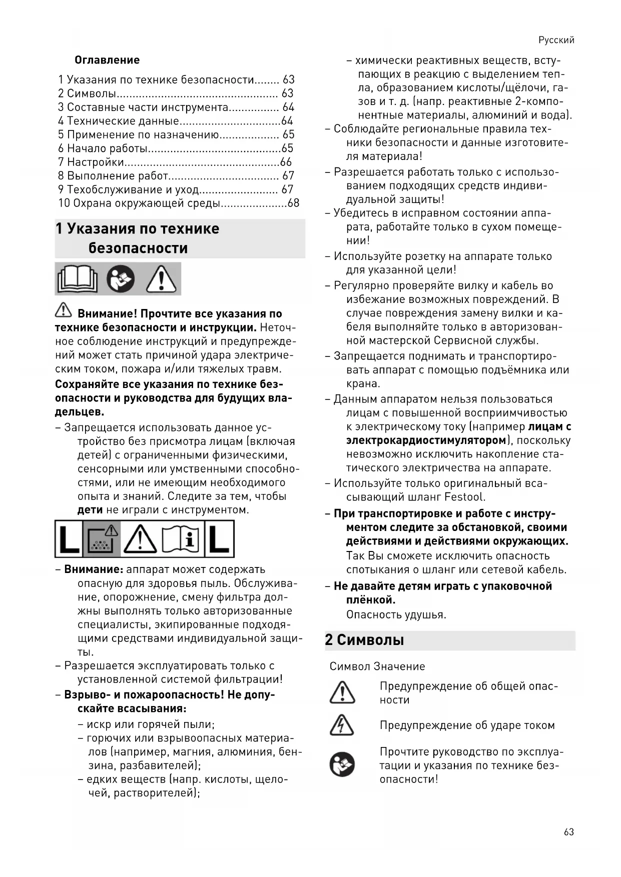– Запрещается использовать данное ус тройство без присмотра лицам (включая детей) с ограниченными физическими, сенсорными или умственными способно стями, или не имеющим необходимого опыта и знаний. Следите за тем, чтобы дети не играли с инструментом. – Внимание: аппарат может содержать опасную для здоровья пыль. Обслужива ние, опорожнение, смену фильтра дол жны выполнять только авторизованные специалисты, экипированные подходя щими средствами индивидуальной защи