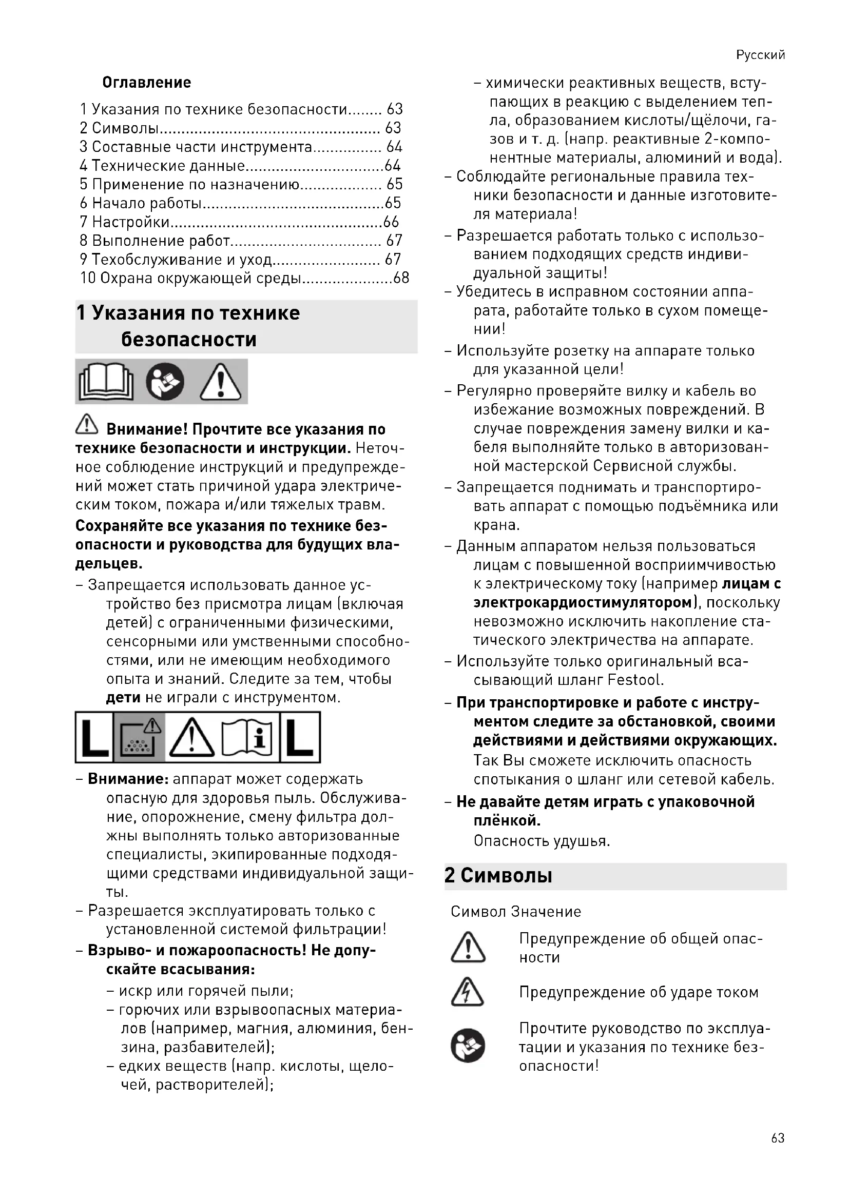 – Данным аппаратом нельзя пользоваться лицам с повышенной восприимчивостью к электрическому току (например лицам с электрокардиостимулятором ), поскольку невозможно исключить накопление ста тического электричества на аппарате. – Используйте только оригинальный вса сывающий шланг Festool. – При транспортировке и работе с инстру ментом следите за обстановкой, своими действиями и действиями окружающих. Так Вы сможете исключить опасность спотыкания о шланг или сетевой кабель. – Не давайте детям играть с упаковочной