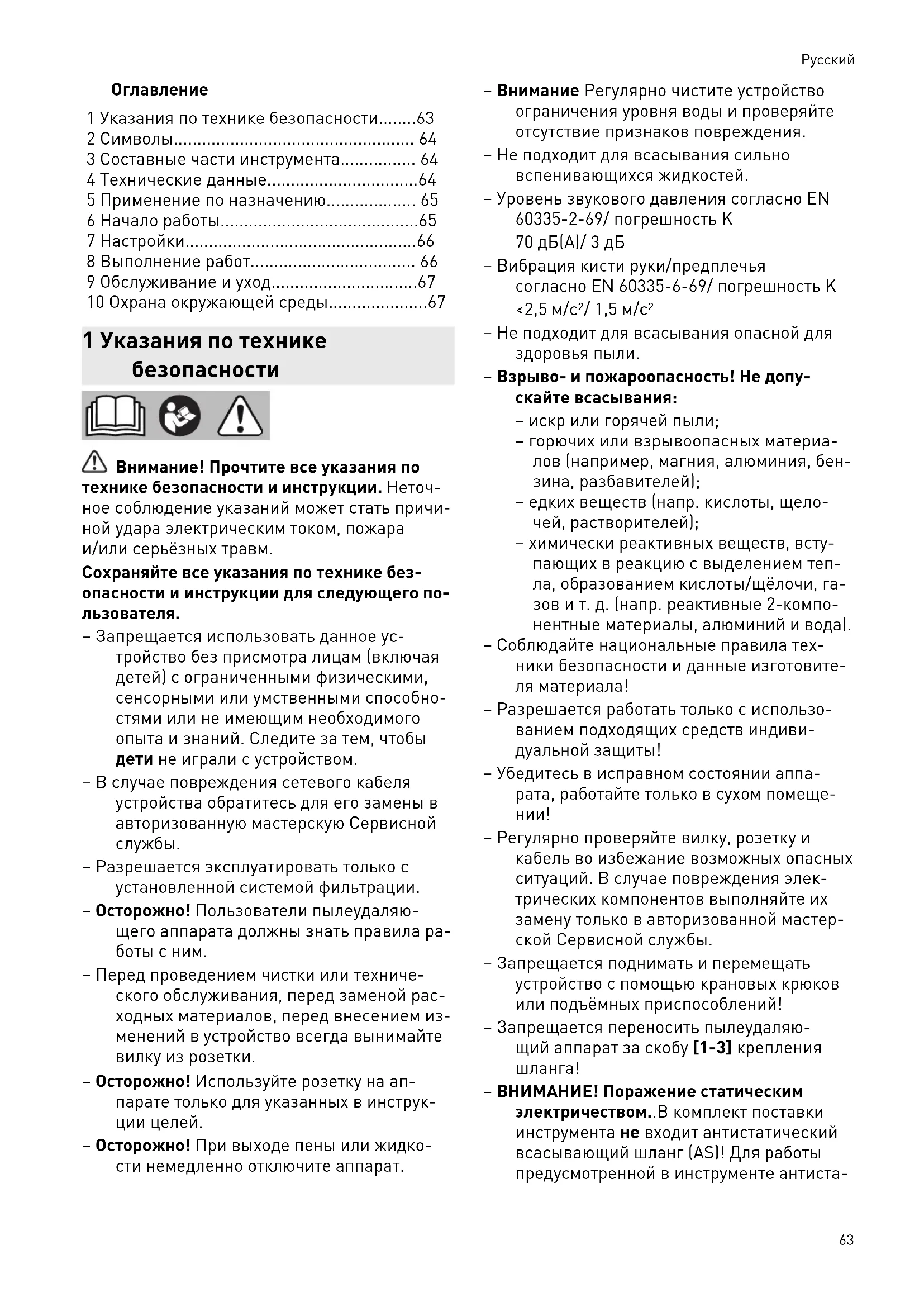 – Осторожно! При выходе пены или жидко сти немедленно отключите аппарат. – Внимание Регулярно чистите устройство ограничения уровня воды и проверяйте отсутствие признаков повреждения. – Не подходит для всасывания сильно вспенивающихся жидкостей. – Уровень звукового давления согласно EN 60335-2-69/ погрешность K 70 дБ(A)/ 3 дБ – Вибрация кисти руки/предплечья согласно EN 60335-6-69/ погрешность K <2,5 м/с²/ 1,5 м/с² – Не подходит для всасывания опасной для здоровья пыли. – Взрыво- и пожароопасность! Не допу скайте всасывания: – искр или горячей пыли; – горючих или взрывоопасных материа лов (например, магния, алюминия, бен зина, разбавителей); – едких веществ (напр. кислоты, щело чей, растворителей); – химически реактивных веществ, всту пающих в реакцию с выделением теп ла, образованием кислоты/щёлочи, га зов и т. д. (напр. реактивные 2-компо нентные материалы, алюминий и вода). – Соблюдайте национальные правила тех ники безопасности и данные изготовите ля материала! – Разрешается работать только с использо ванием подходящих средств индиви дуальной защиты! – Убедитесь в исправном состоянии аппа рата, работайте только в сухом помеще
