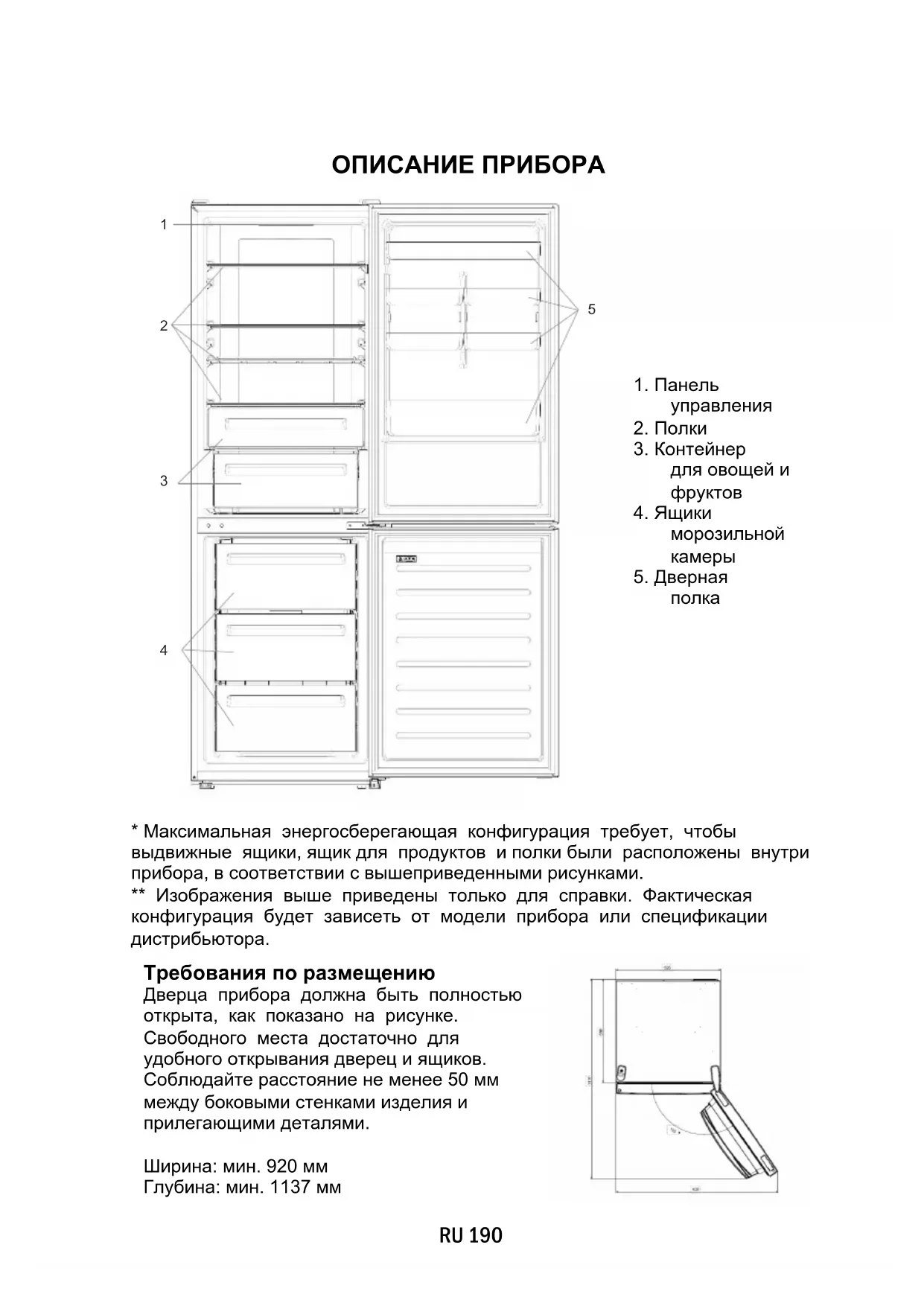 Требования по размещению Дверца прибора должна быть полностью открыта, как показано на рисунке. Свободного места достаточно для удобного открывания дверец и ящиков. Соблюдайте расстояние не менее 50 мм между боковыми стенками изделия и прилегающими деталями. Ширина: мин. 920 мм Глубина: мин. 1137 ммRU 191 ИСПОЛЬЗОВАНИЕ A. Кнопка включения/выключения, используемая для включения/выключения прибора B. Клавиша Wi-Fi, используемая для включения/выключения Wi-Fi C. Кнопка Mode, используемая для выбора требуемой функции D. Кнопка TEMP, используемая для выбора температуры в холодильном и морозильном