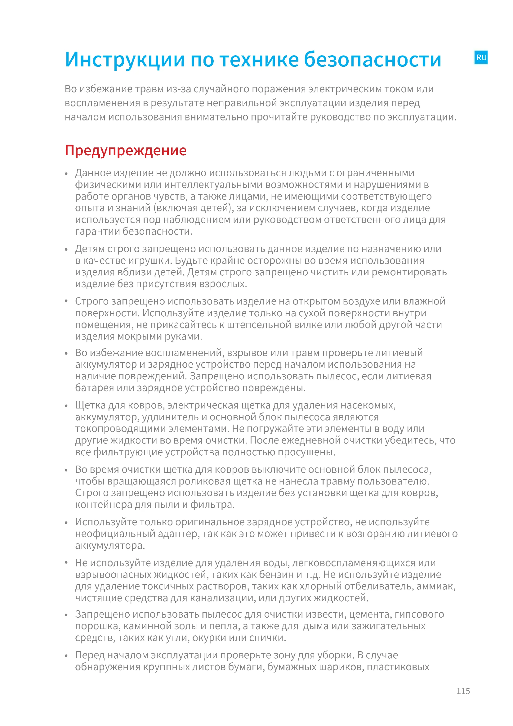 Перед началом эксплуатации проверьте зону для уборки. В случае обнаружения круппных листов бумаги, бумажных шариков, пластиковыхRU