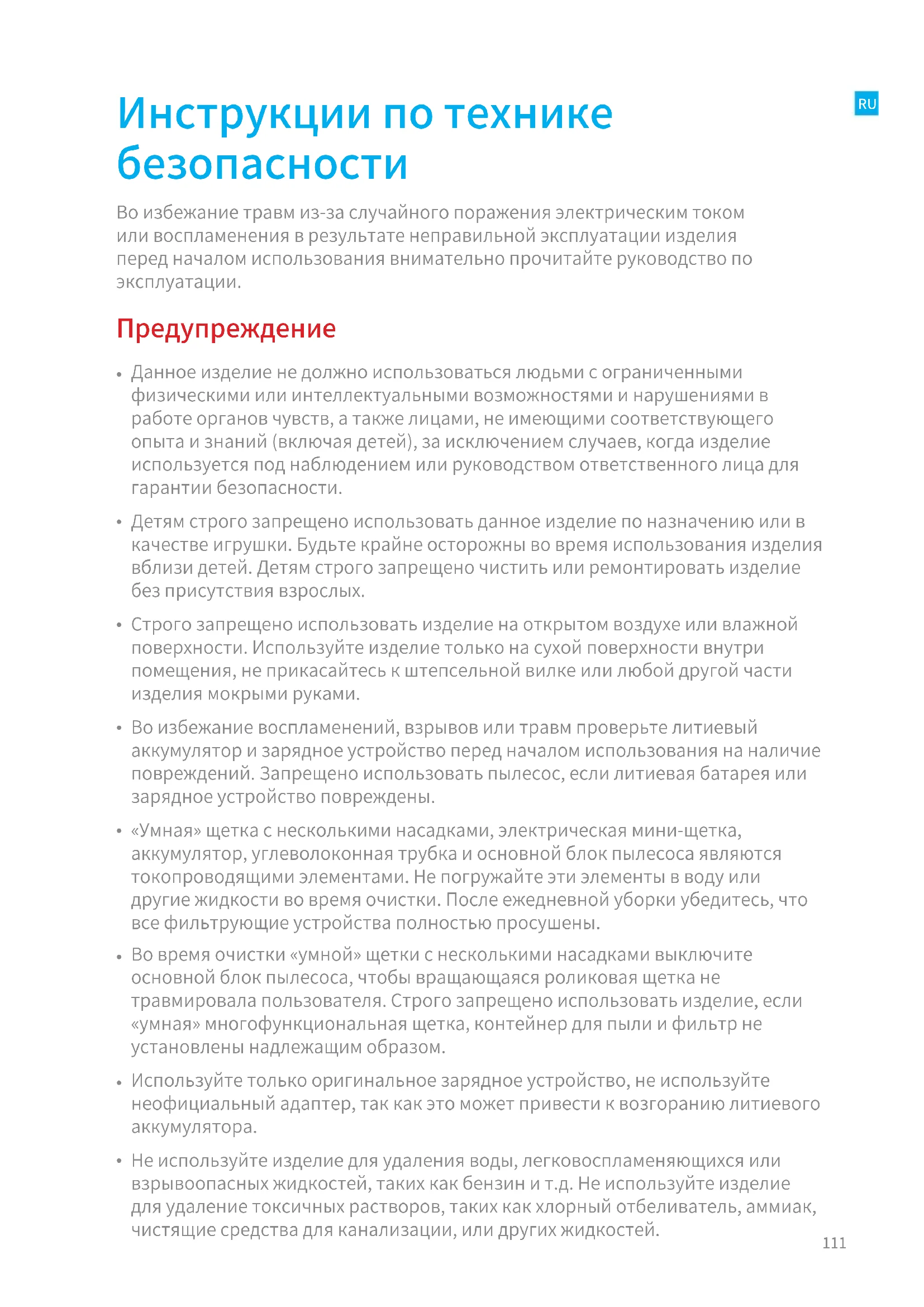 Не используйте изделие для удаления воды, легковоспламеняющихся или взрывоопасных жидкостей, таких как бензин и т.д. Не используйте изделие для удаление токсичных растворов, таких как хлорный отбеливатель, аммиак, чистящие средства для канализации, или других жидкостей.112